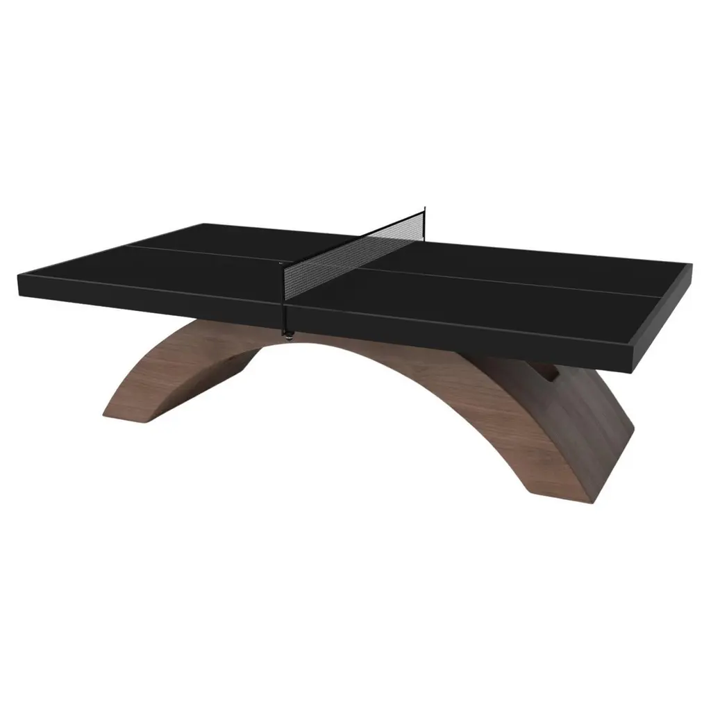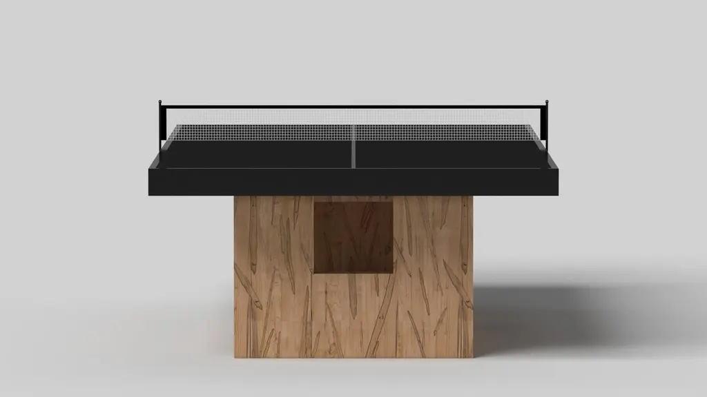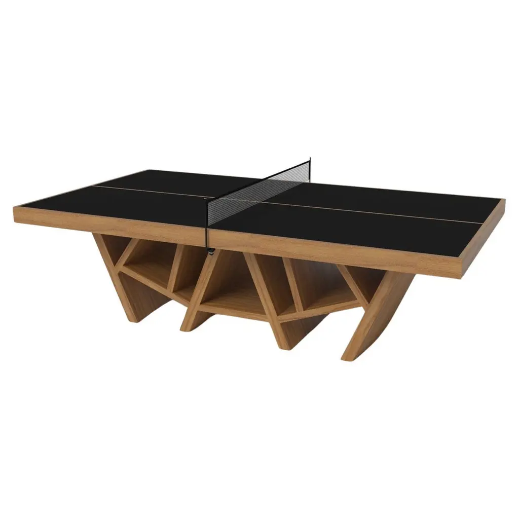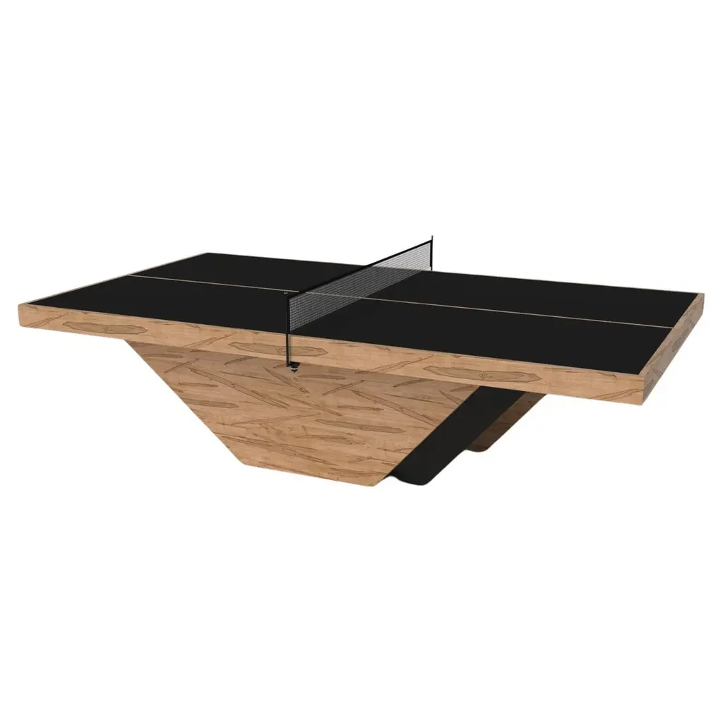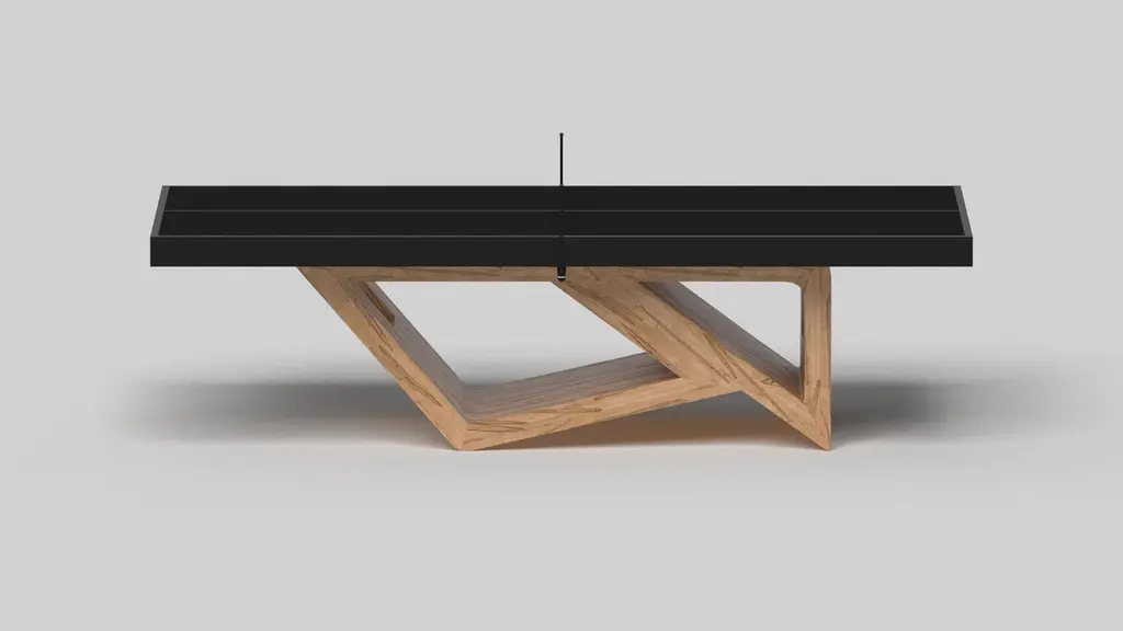Drawing inspiration from the beauty of geometric forms, the Rumba table tennis table in brushed aluminum is characterized by a series of hollow and solid shapes that form an offset asymmetric base. Accented with a smooth top and a standard table tennis net for professional game play, this custom table features a high-end designer appeal that coordinates seamlessly into any modern room design. Size:108”X60”X30”Custom Sizes Available Per Request