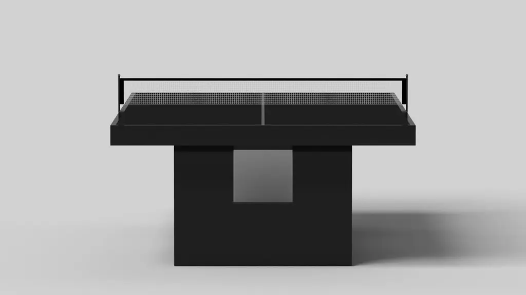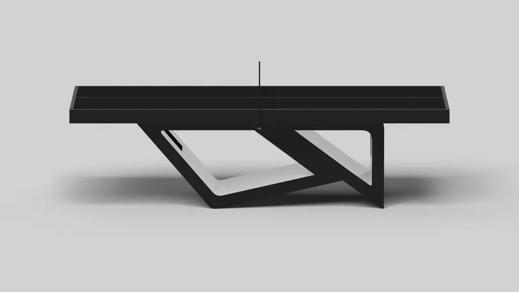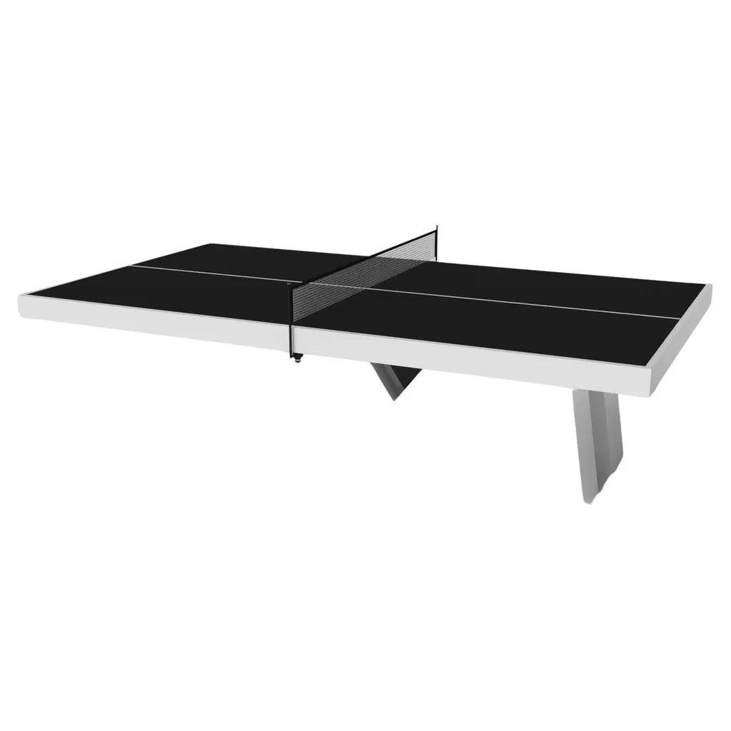Drawing inspiration from the beauty of geometric forms, the Rumba table tennis table in brushed aluminum is characterized by a series of hollow and solid shapes that form an offset asymmetric base. Accented with a smooth top and a standard table tennis net for professional game play, this custom table features a high-end designer appeal that coordinates seamlessly into any modern room design.Size:108”X60”X30”Custom Sizes Available Per Request