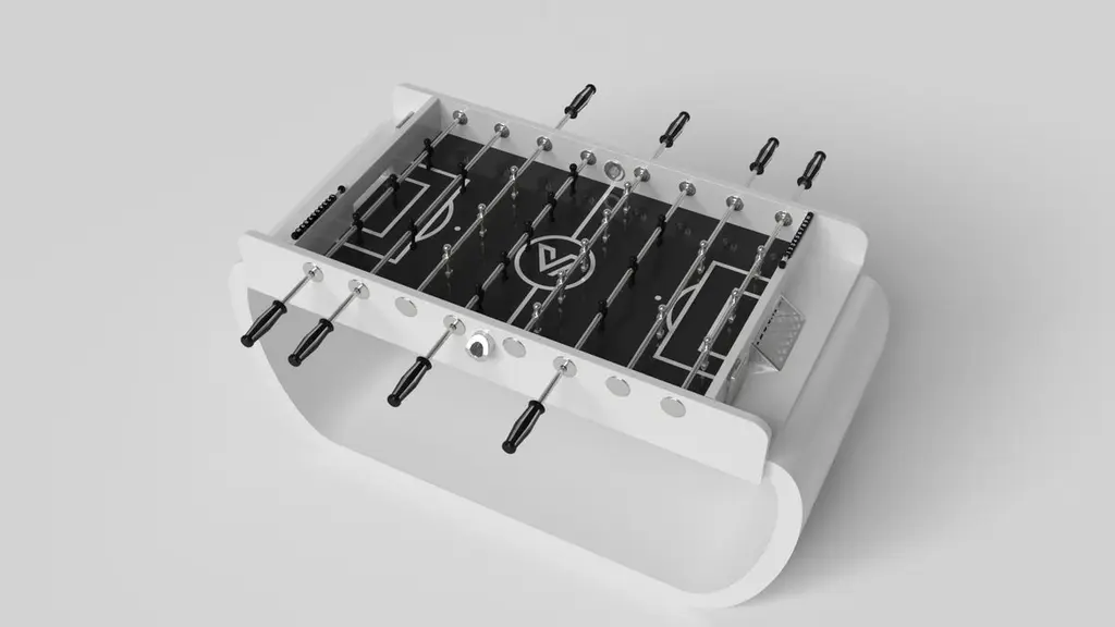 Handcrafted with intricate accents and a precision-carved curved base, the Sid foosball table in black encompasses a series of smooth edges, distinctive details, and unconventional elements in one unique expression of luxury design. Built by hand from solid maple wood, this contemporary game table boasts a signature blend of expert craftsmanship and novel composition.Size:62”X31”X36”