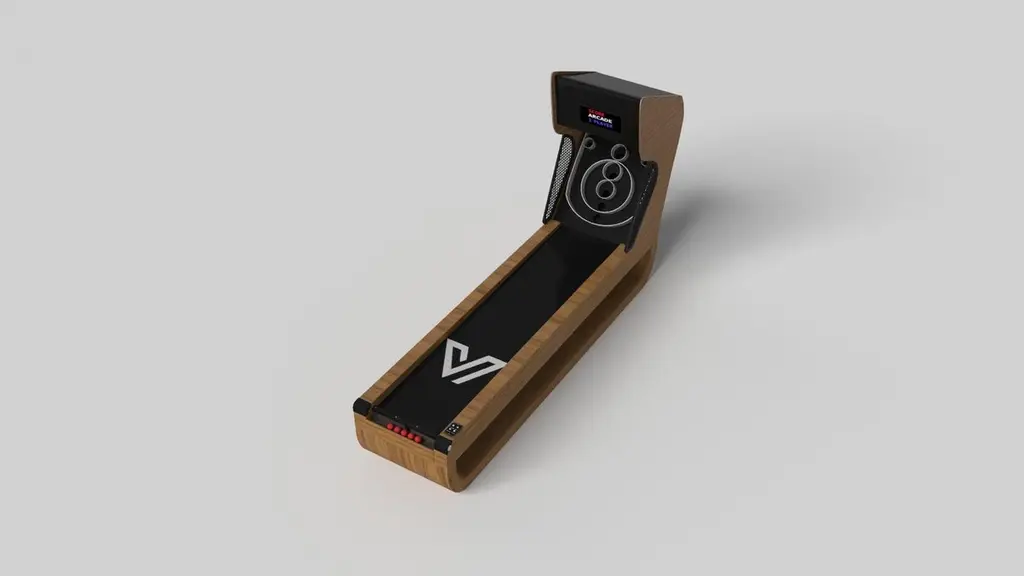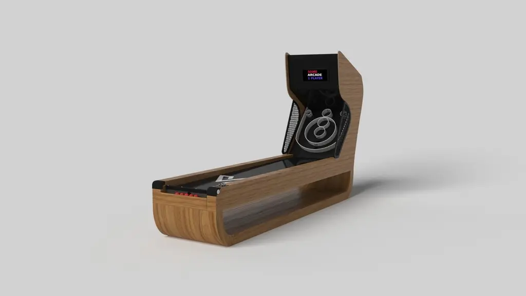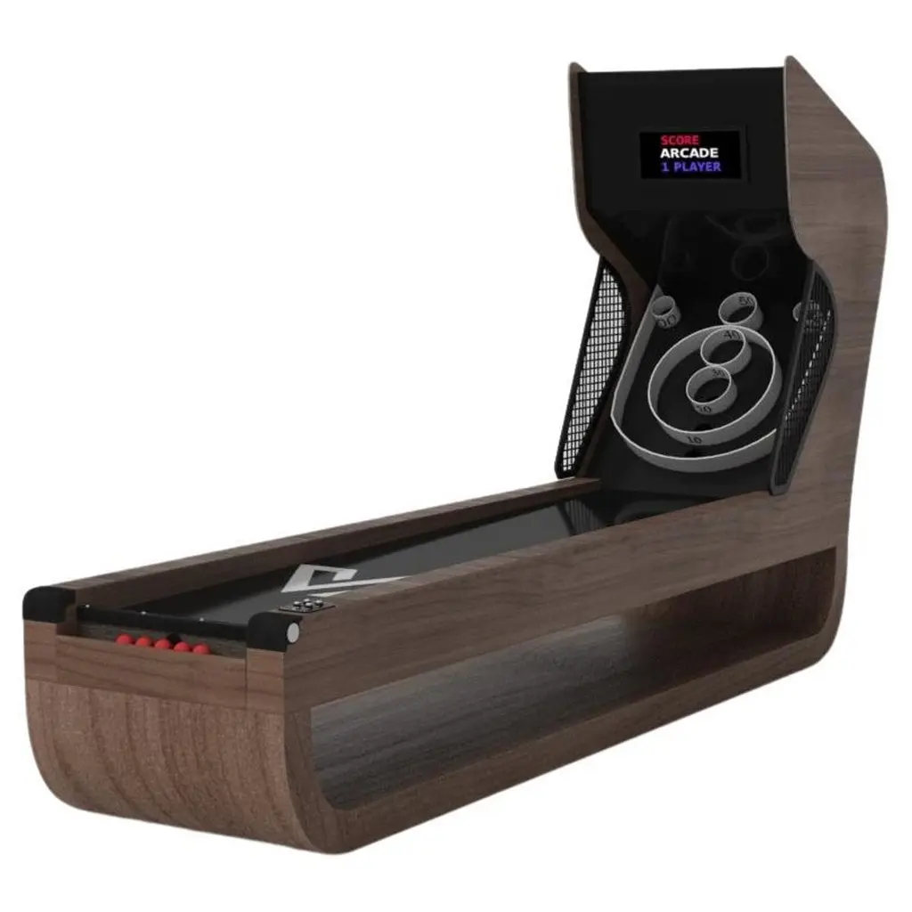 Handcrafted with intricate accents and a precision-carved curved base, the Sid skeeball game encompasses a series of smooth edges, distinctive details, and unconventional elements in one unique expression of luxury design. Built by hand from solid wood, this contemporary game boasts a signature blend of expert craftsmanship and novel composition. Digital components, including LED lights and sound effects, are built into the design.
