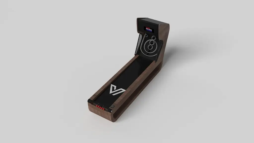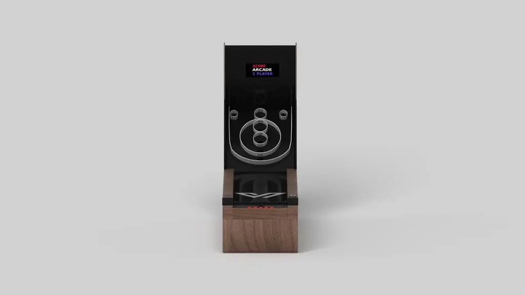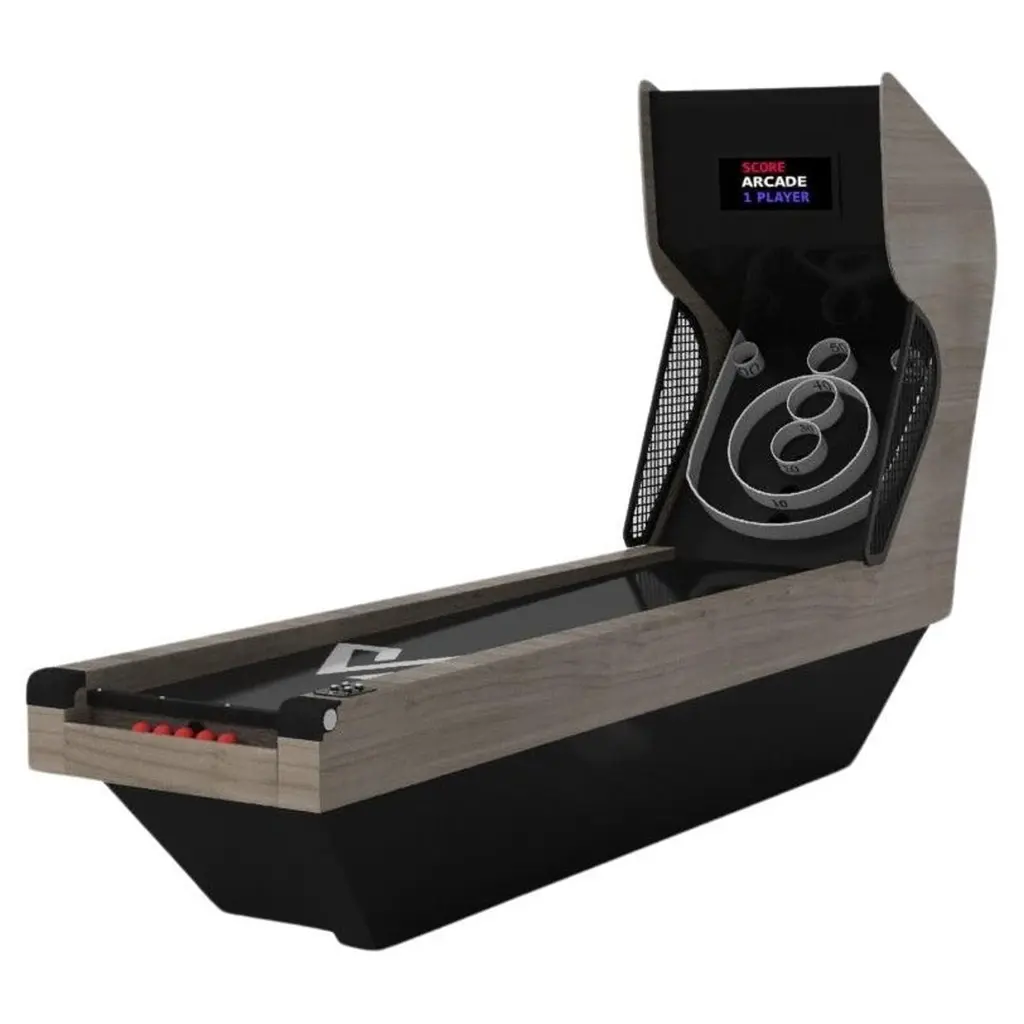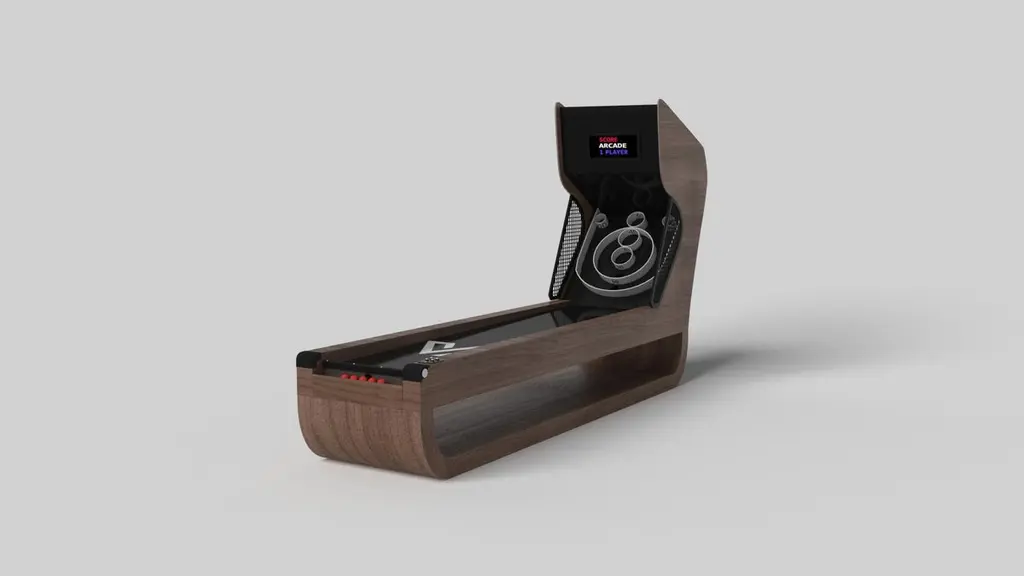 Handcrafted with intricate accents and a precision-carved curved base, the Sid skeeball game encompasses a series of smooth edges, distinctive details, and unconventional elements in one unique expression of luxury design. Built by hand from solid wood, this contemporary game boasts a signature blend of expert craftsmanship and novel composition. Digital components, including LED lights and sound effects, are built into the design.