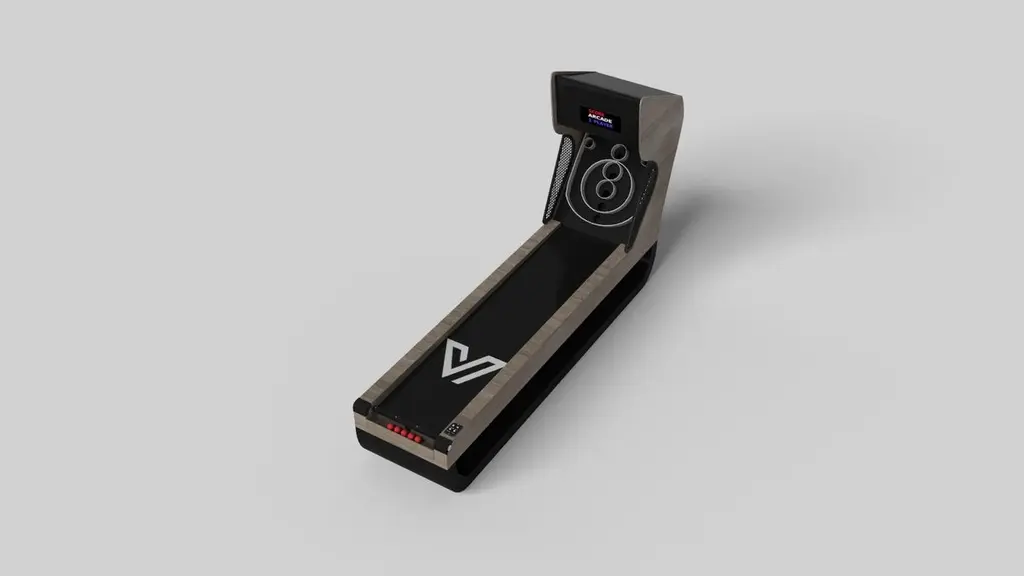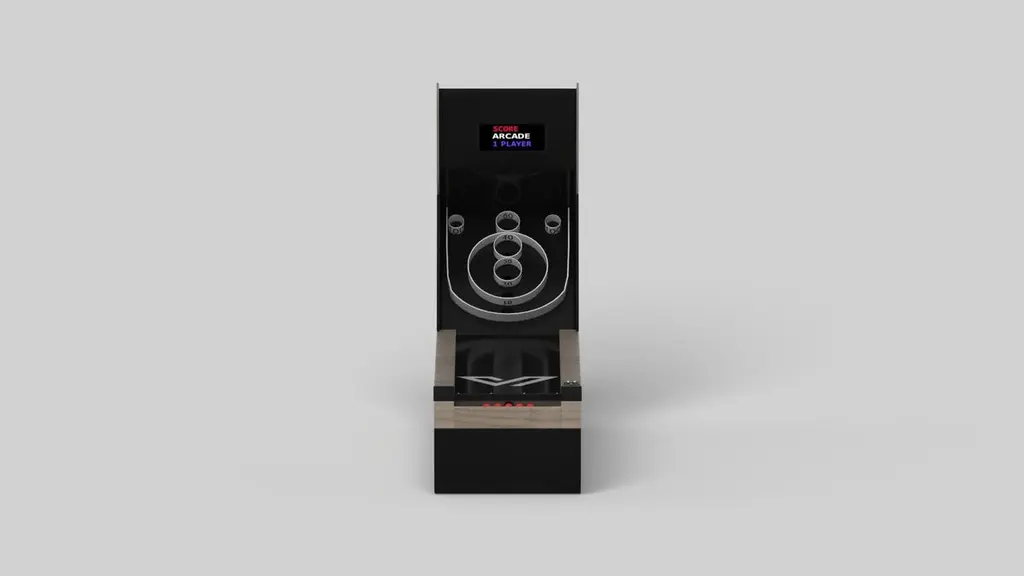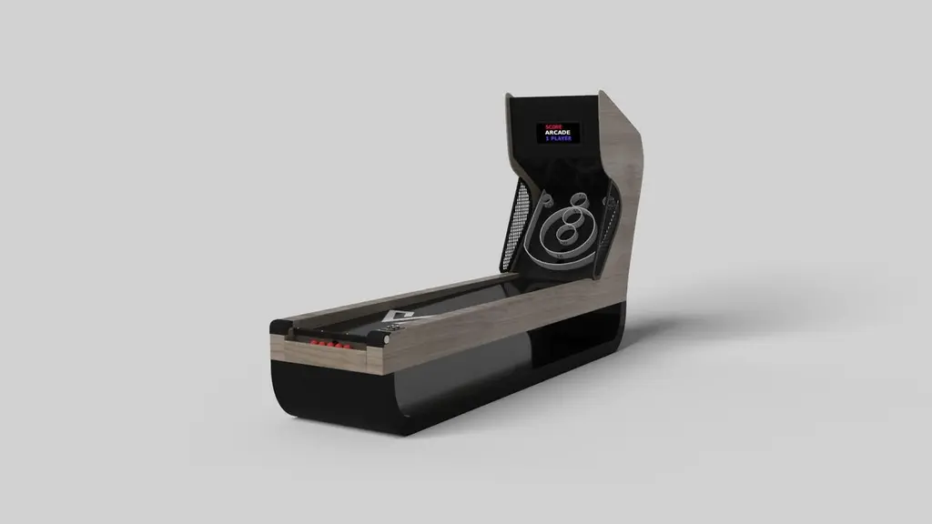 Handcrafted with intricate accents and a precision-carved curved base, the Sid skeeball game encompasses a series of smooth edges, distinctive details, and unconventional elements in one unique expression of luxury design. Built by hand from solid wood, this contemporary game boasts a signature blend of expert craftsmanship and novel composition. Digital components, including LED lights and sound effects, are built into the design.