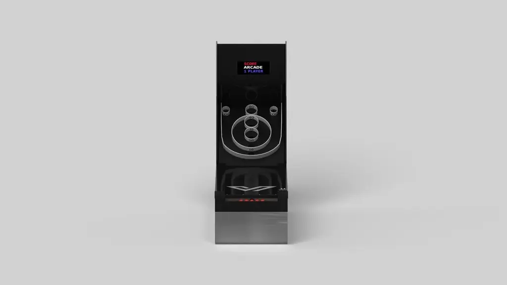 Handcrafted with intricate accents and a precision-carved curved base, the Sid skeeball game encompasses a series of smooth edges, distinctive details, and unconventional elements in one unique expression of luxury design. Built by hand from solid wood, this contemporary game boasts a signature blend of expert craftsmanship and novel composition. Digital components, including LED lights and sound effects, are built into the design.