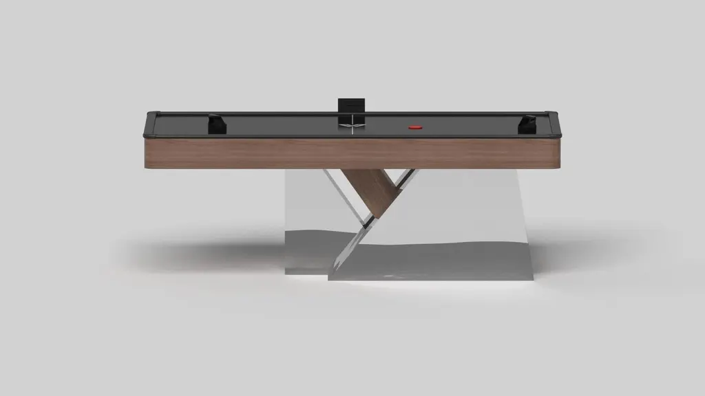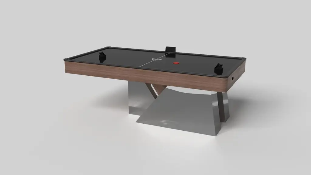 An asymmetric base creates a free-floating silhouette, making the Stilt air hockey table in chrome with walnut a compelling, contemporary addition to the modern home. Crafted from durable metal with solid walnut wood accents, this luxury handcrafted game table boasts an exclusive, thought provoking design with an angled, offset base that seems to defy the laws of gravity and logic.Size:88”X45”X31”