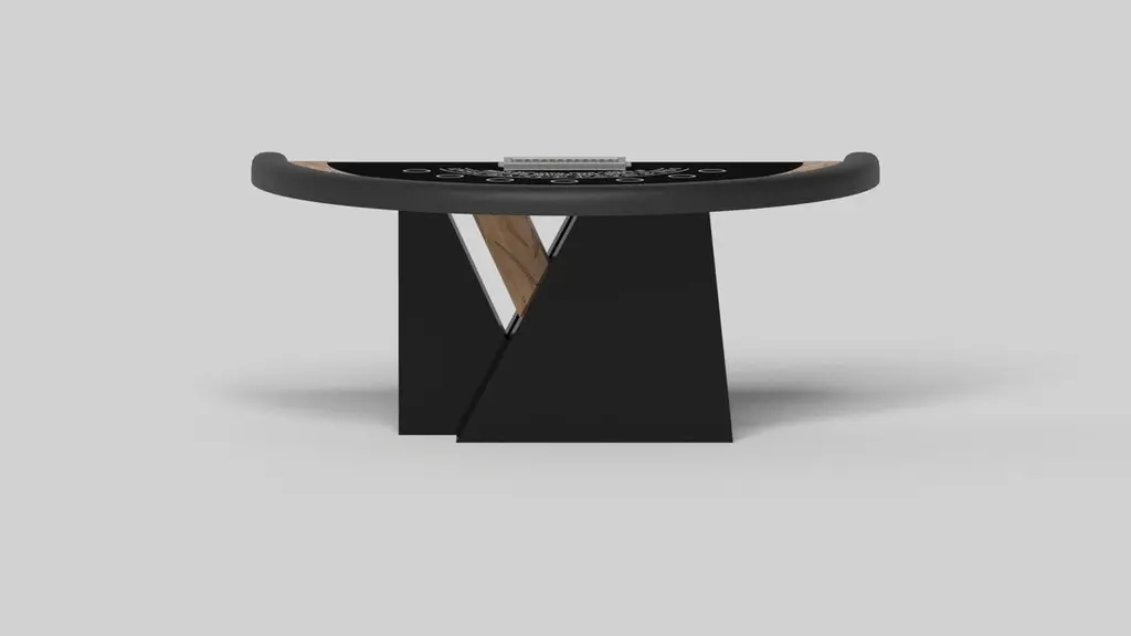 An asymmetric base creates a free-floating silhouette, making the Stilt blackjack table in walnut a compelling, contemporary addition to the modern home. Detailed with a chip rack and betting circles, this luxury handcrafted game table boasts an exclusive, thought provoking design with an angled, offset base that seems to defy the laws of gravity and logic.Size:88”X46”X30” (Bar Height)Custom Sizes Available Per Request