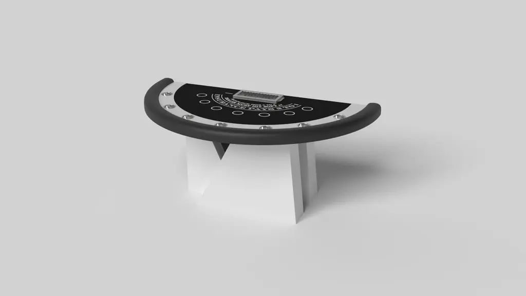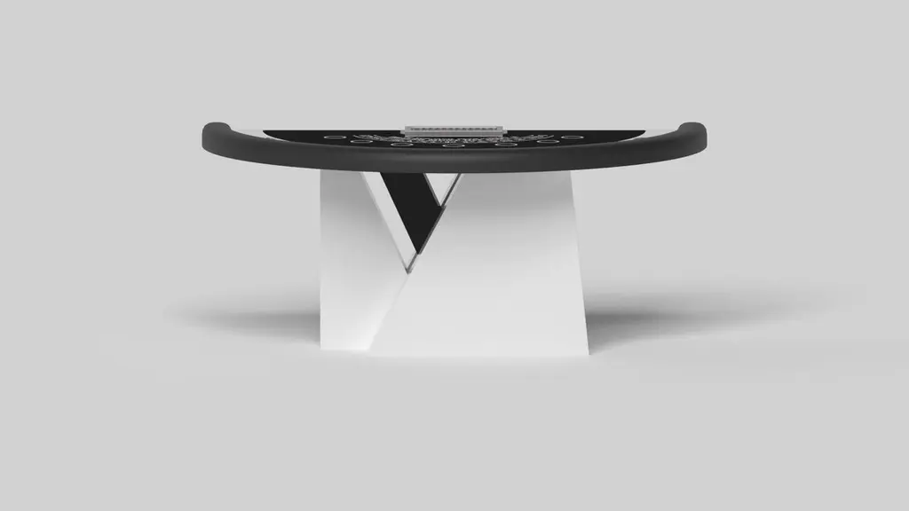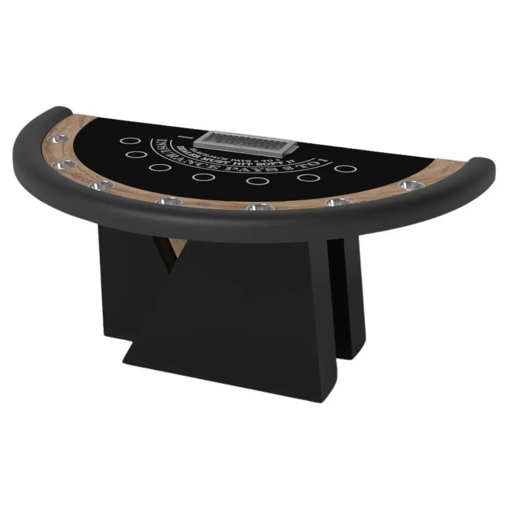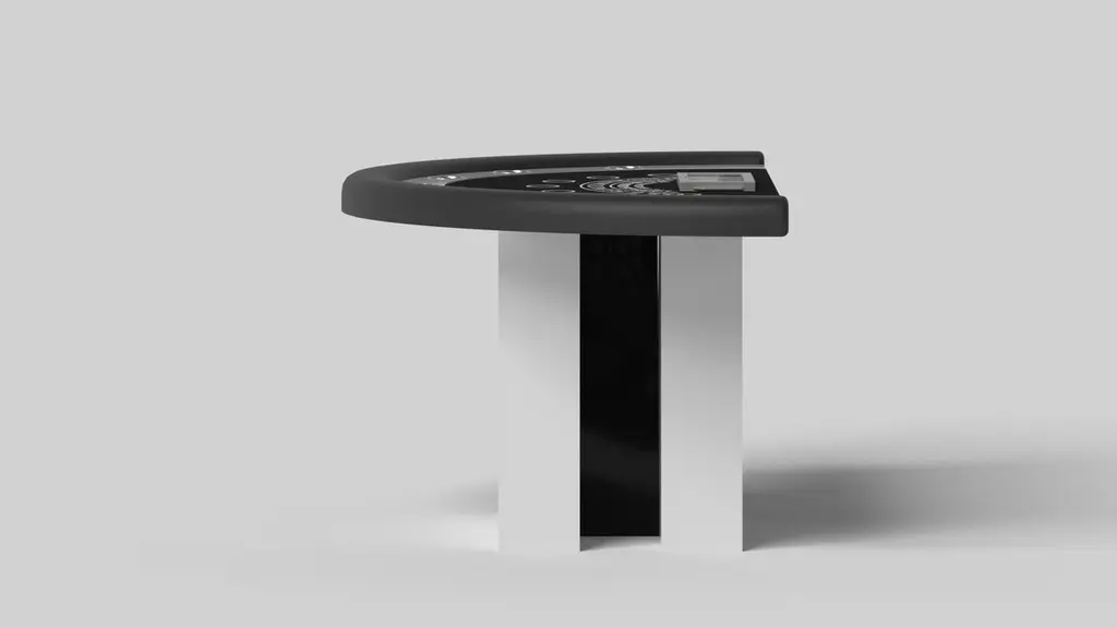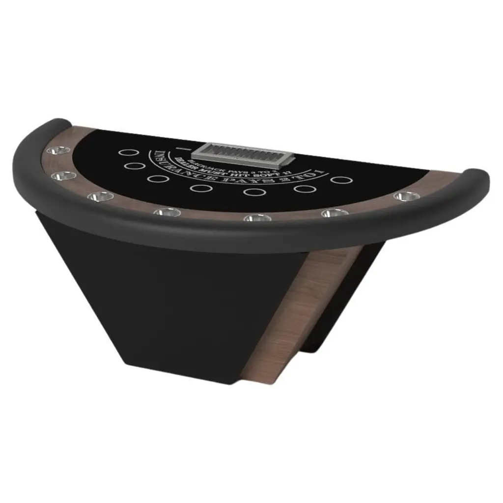 An asymmetric base creates a free-floating silhouette, making the Stilt blackjack table in walnut a compelling, contemporary addition to the modern home. Detailed with a chip rack and betting circles, this luxury handcrafted game table boasts an exclusive, thought provoking design with an angled, offset base that seems to defy the laws of gravity and logic.Size:88”X46”X30” (Bar Height)Custom Sizes Available Per Request