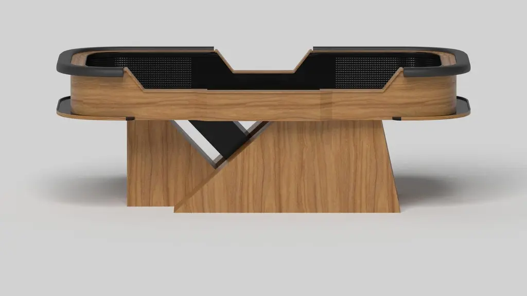 An asymmetric base creates a free-floating silhouette, making the Stilt craps table in walnut a compelling, contemporary addition to the modern home. Detailed with point boxes and betting blocks, this luxury handcrafted game table boasts an exclusive, thought provoking design with an angled, offset base that seems to defy the laws of gravity and logic.Size:117”X60”X42”Custom Sizes Available Per Request