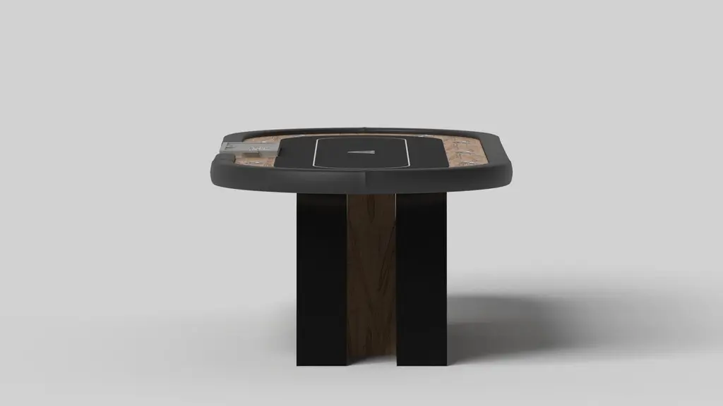 An asymmetric base creates a free-floating silhouette, making the Stilt poker table in chrome with walnut a compelling, contemporary addition to the modern home. Crafted from durable metal with solid walnut wood accents, this luxury handcrafted game table boasts an exclusive, thought provoking design with an angled, offset base that seems to defy the laws of gravity and logic.Size:104”X44”X30”Custom Sizes Available Per RequestCustom Table-Top Shapes Available Per Request
