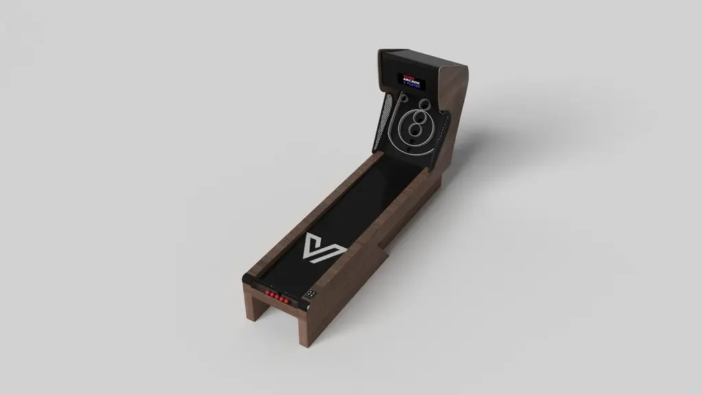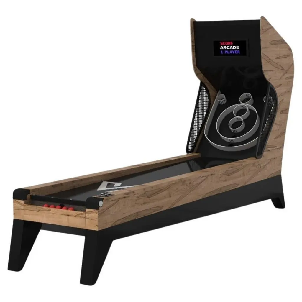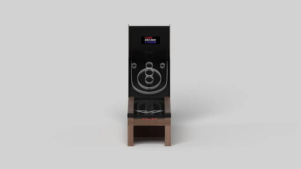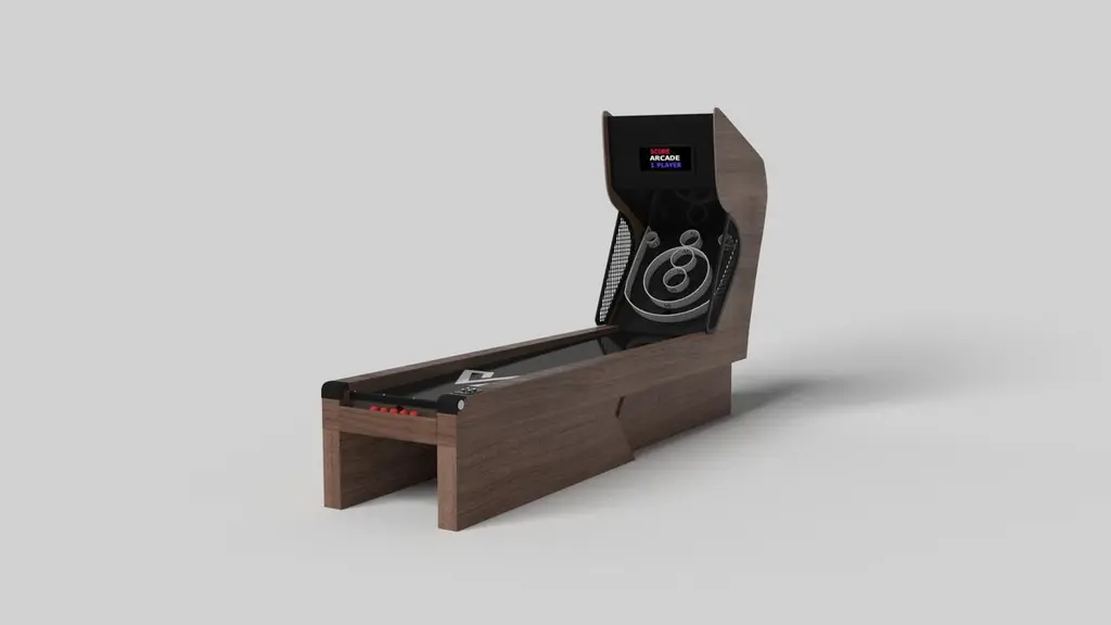 An asymmetric base creates a free-floating silhouette, making the Stilt skeeball game a compelling, contemporary addition to the modern home. Crafted from solid wood, this luxury game boasts an exclusive, thought provoking design with an angled, offset base that seems to defy the laws of gravity and logic. It's detailed with arcade-inspired digital components, including LED lights and sound effects.