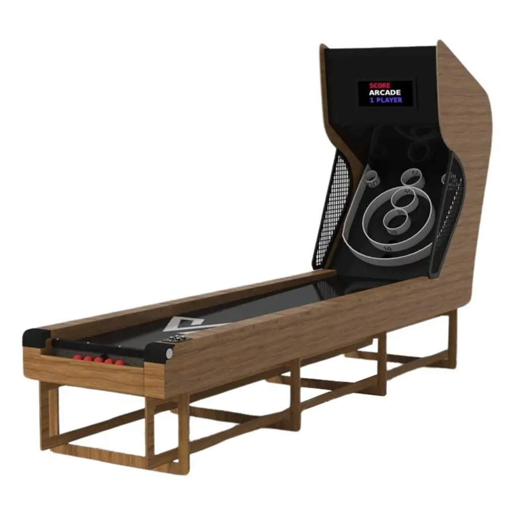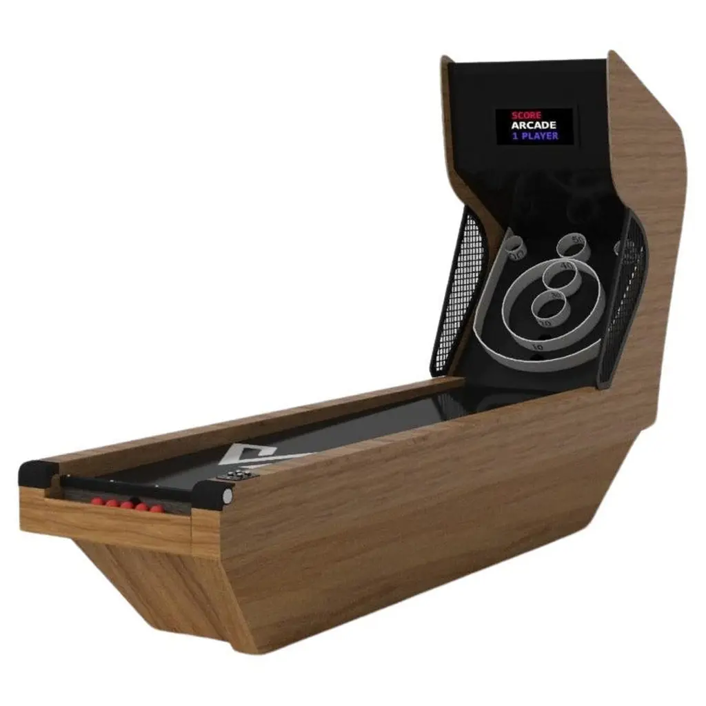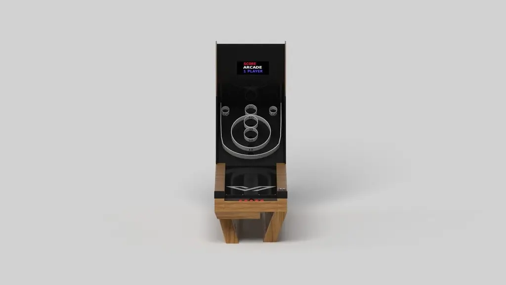 A contemporary composition of clean lines and sleek edges, the Trinity skeeball game is an elegant expression of modern design. Handcrafted and detailed with built-in digital components, this game offers statement-making style with sharp angles that form three distinct triangles when viewed from the side. When viewed from each end, a Z-shaped pattern takes form, giving it bold, geometric appeal to fits seamlessly into any modern room design.
