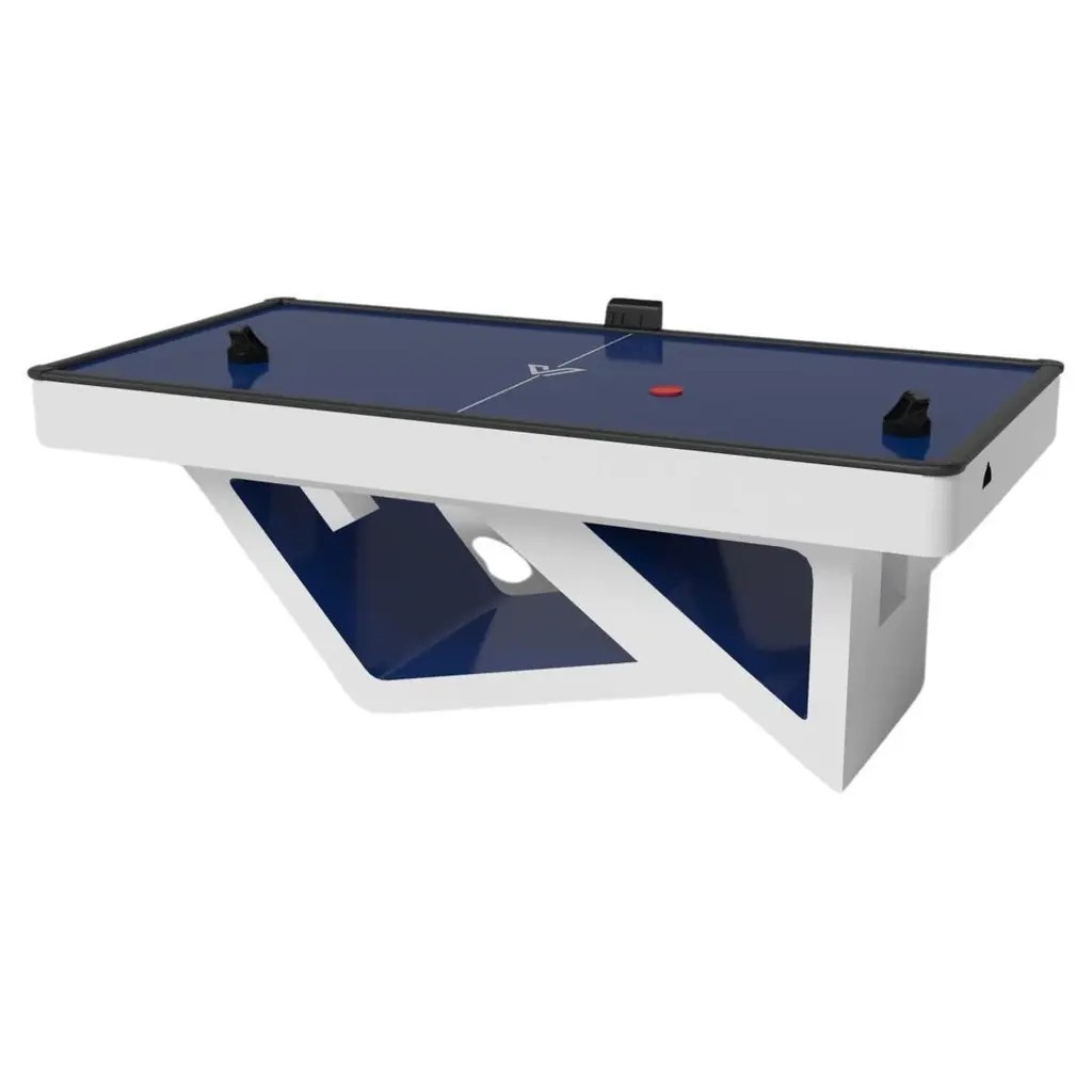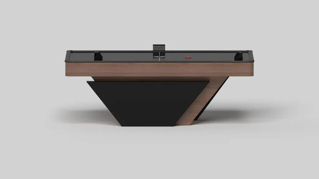 Handcrafted with clean lines, sharp angles, and a pyramid base, the Vogue air hockey table in chrome with black strikes the perfect balance between sport-inspired style and contemporary design. Timeless in its appeal and revered for its practicality and purpose, this custom game table is beautifully crafted from durable metal with black maple wood accents that give it a cutting edge look.Size:88”X45”X31”