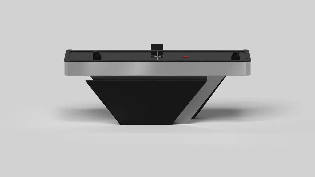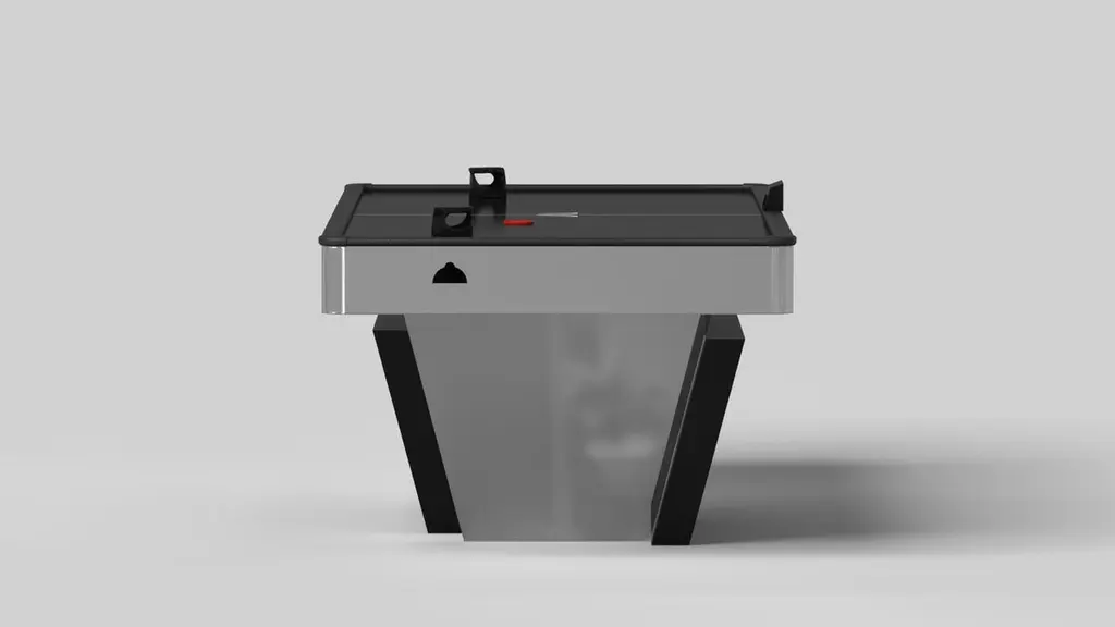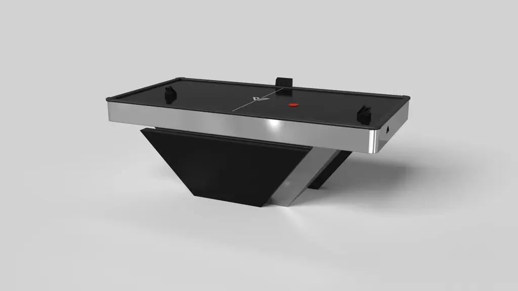 Handcrafted with clean lines, sharp angles, and a pyramid base, the Vogue air hockey table in chrome with black strikes the perfect balance between sport-inspired style and contemporary design. Timeless in its appeal and revered for its practicality and purpose, this custom game table is beautifully crafted from durable metal with black maple wood accents that give it a cutting edge look.Size:88”X45”X31”