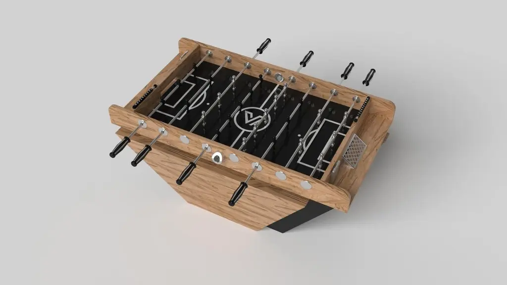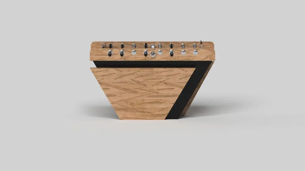 Handcrafted with clean lines, sharp angles, and a pyramid base, the Vogue foosball table in chrome with black strikes the perfect balance between sport-inspired style and contemporary design. Timeless in its appeal and revered for its practicality and purpose, this custom game table is beautifully crafted from durable metal with black maple wood accents that give it a cutting edge look.Size:62”X31”X36”