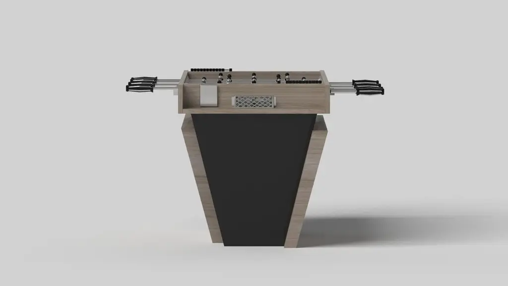 Handcrafted with clean lines, sharp angles, and a pyramid base, the Vogue foosball table in chrome with black strikes the perfect balance between sport-inspired style and contemporary design. Timeless in its appeal and revered for its practicality and purpose, this custom game table is beautifully crafted from durable metal with black maple wood accents that give it a cutting edge look.Size:62”X31”X36”