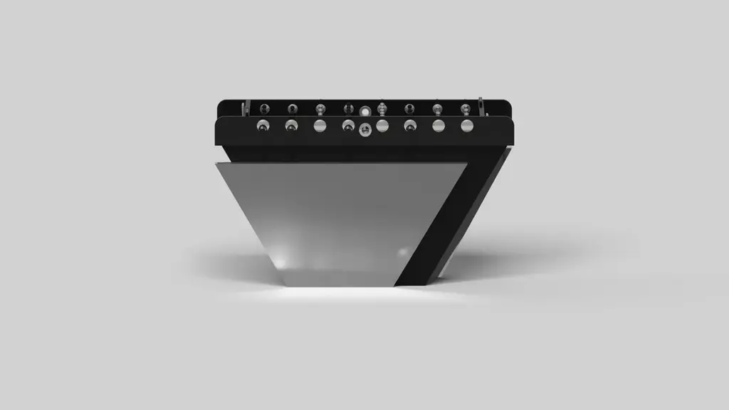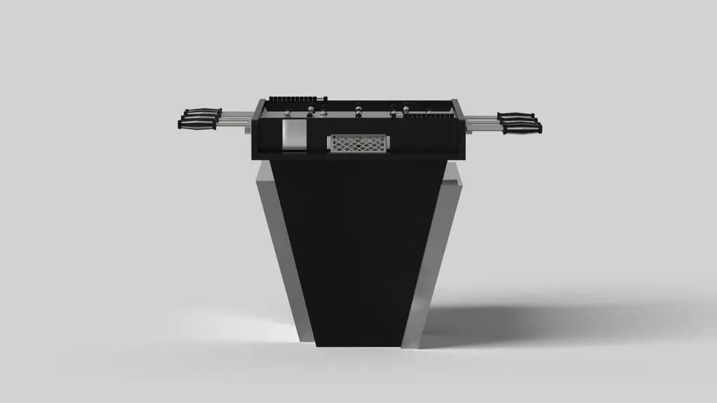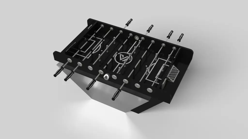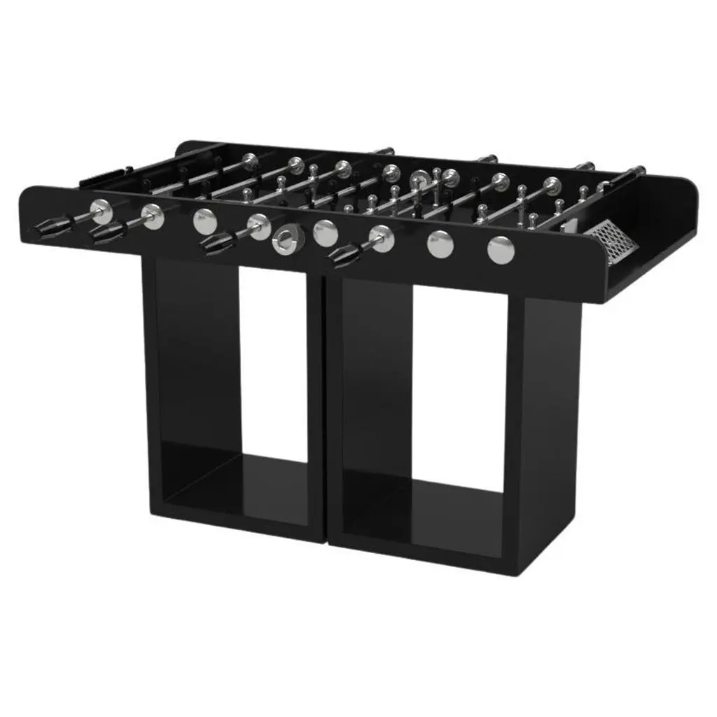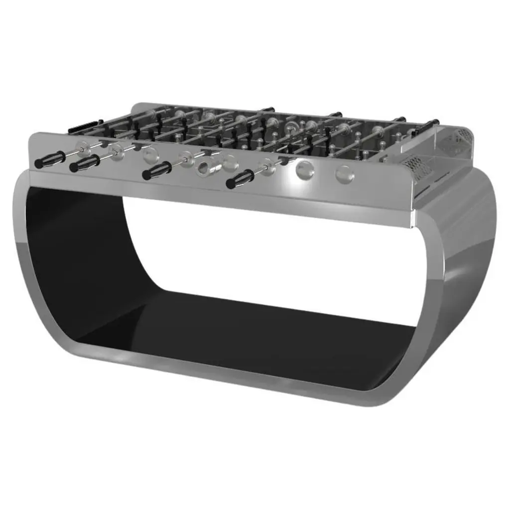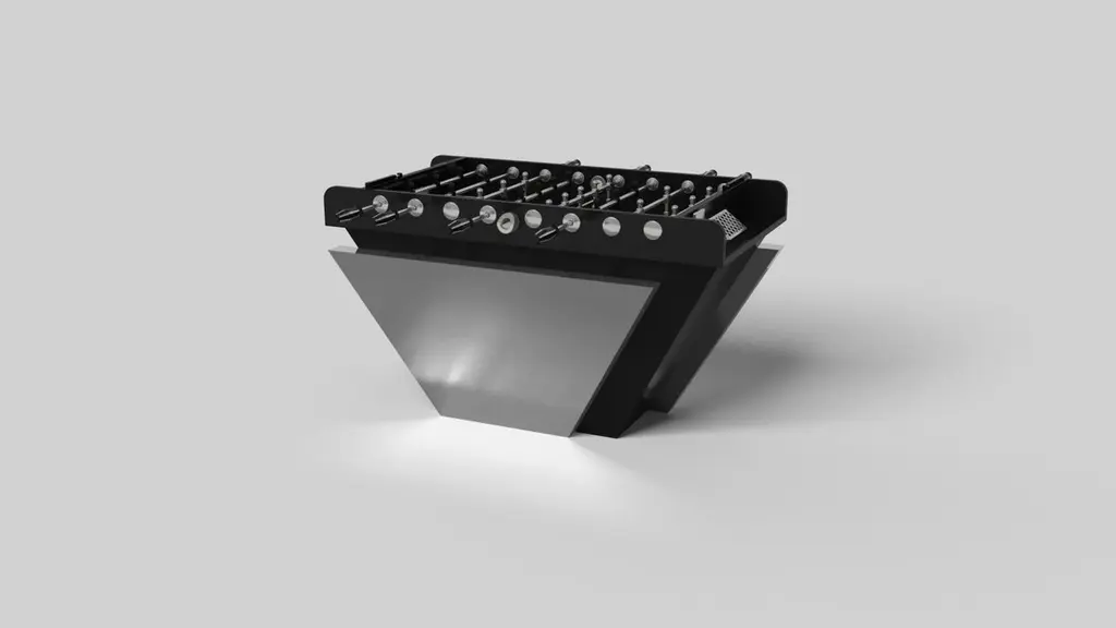 Handcrafted with clean lines, sharp angles, and a pyramid base, the Vogue foosball table in chrome with black strikes the perfect balance between sport-inspired style and contemporary design. Timeless in its appeal and revered for its practicality and purpose, this custom game table is beautifully crafted from durable metal with black maple wood accents that give it a cutting edge look.Size:62”X31”X36”