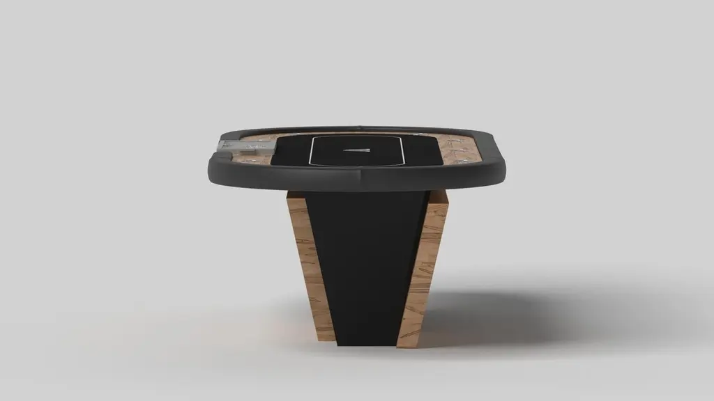 Handcrafted with clean lines, sharp angles, and a pyramid base, the Vogue poker table in chrome with black strikes the perfect balance between sport-inspired style and contemporary design. Timeless in its appeal and revered for its practicality and purpose, this custom game table is beautifully crafted from durable metal with black maple wood accents that give it a cutting edge look.Size:104”X44”X30”Custom Sizes Available Per RequestCustom Table-Top Shapes Available Per Request
