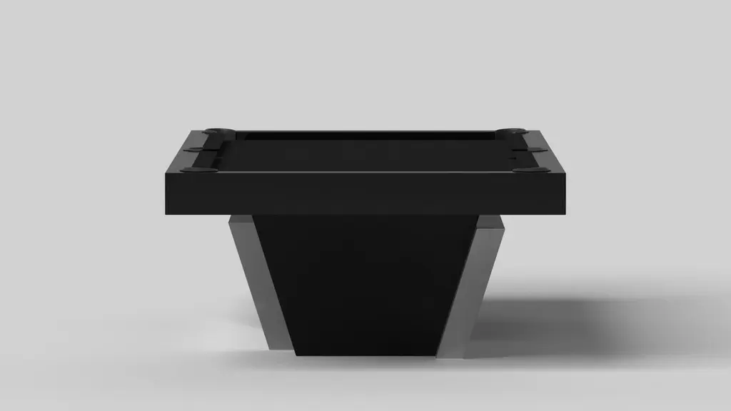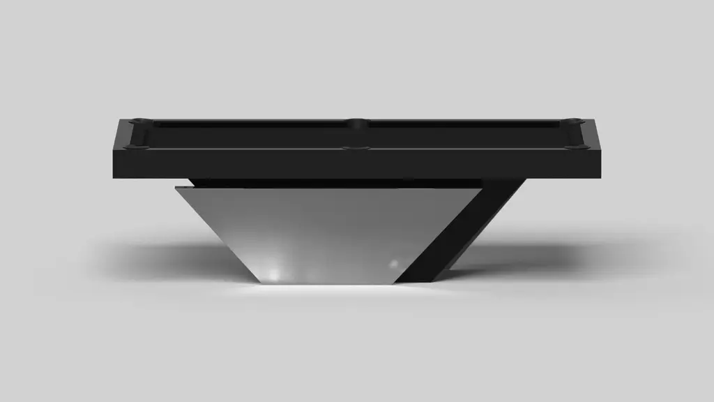 Handcrafted with clean lines, sharp angles, and a pyramid base, the Vogue pool table in chrome with black strikes the perfect balance between sport-inspired style and contemporary design. Timeless in its appeal and revered for its practicality and purpose, this custom game table is beautifully crafted from durable metal with black maple wood accents that give it a cutting edge look.Size:9 Foot – 113”X63”Playing Area: 100”X50”