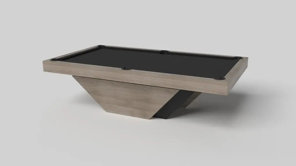 Handcrafted with clean lines, sharp angles, and a pyramid base, the Vogue pool table in chrome with black strikes the perfect balance between sport-inspired style and contemporary design. Timeless in its appeal and revered for its practicality and purpose, this custom game table is beautifully crafted from durable metal with black maple wood accents that give it a cutting edge look.Size:8.5 Foot – 108”X60”Playing Area: 92”X46”