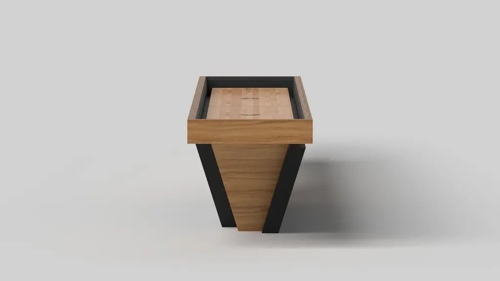 Handcrafted with clean lines, sharp angles, and a pyramid base, the Vogue shuffleboard table in chrome with black strikes the perfect balance between sport-inspired style and contemporary design. Timeless in its appeal and revered for its practicality and purpose, this custom game table is beautifully crafted from durable metal with black maple wood accents that give it a cutting edge look.Size:18 Foot - 216”X32”X34”Playing Area Of 200”X20”