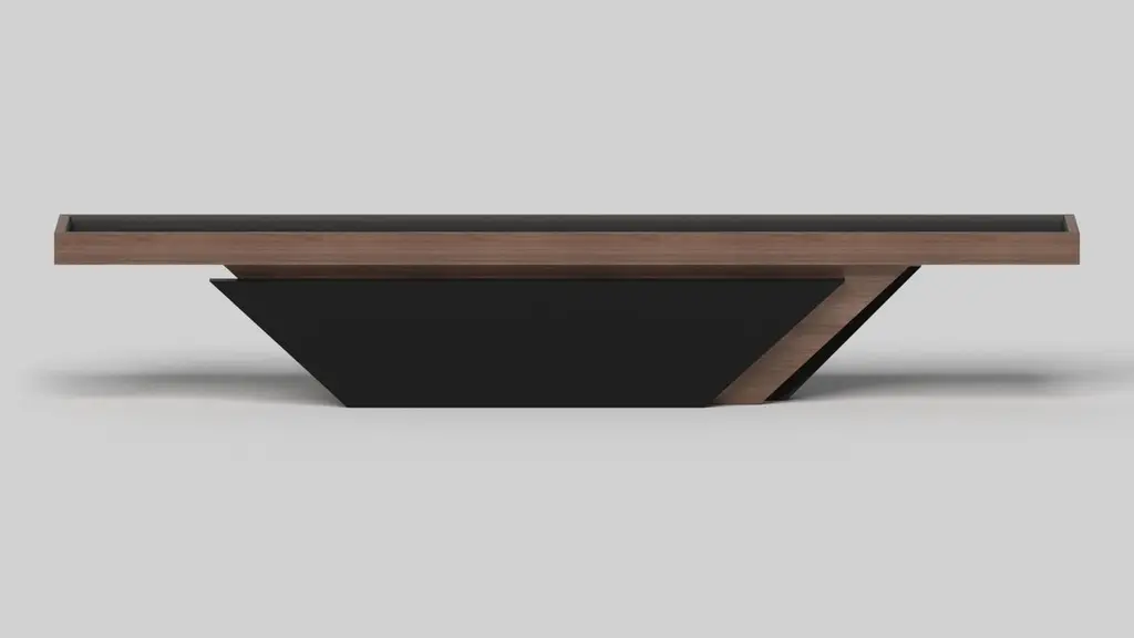 Handcrafted with clean lines, sharp angles, and a pyramid base, the Vogue shuffleboard table in chrome with black strikes the perfect balance between sport-inspired style and contemporary design. Timeless in its appeal and revered for its practicality and purpose, this custom game table is beautifully crafted from durable metal with black maple wood accents that give it a cutting edge look.Size:18 Foot - 216”X32”X34”Playing Area Of 200”X20”