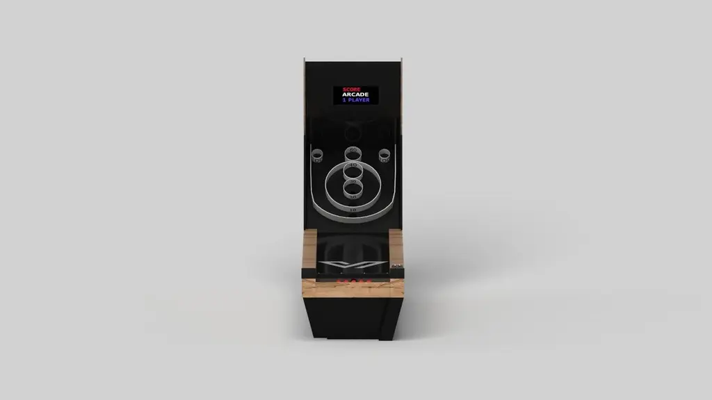 Handcrafted with clean lines, sharp angles, and a pyramid base, the Vogue skeeball game strikes the perfect balance between sporty competition and contemporary design. Timeless in its appeal and detailed with built-in digital components, this custom game is beautifully crafted from durable wood with contrast accents that give it a cutting edge look.
