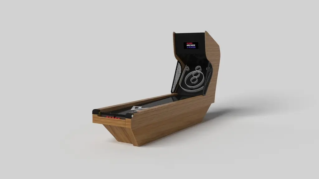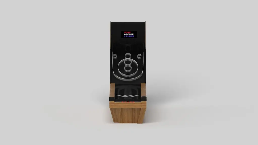 Handcrafted with clean lines, sharp angles, and a pyramid base, the Vogue skeeball game strikes the perfect balance between sporty competition and contemporary design. Timeless in its appeal and detailed with built-in digital components, this custom game is beautifully crafted from durable wood with contrast accents that give it a cutting edge look.