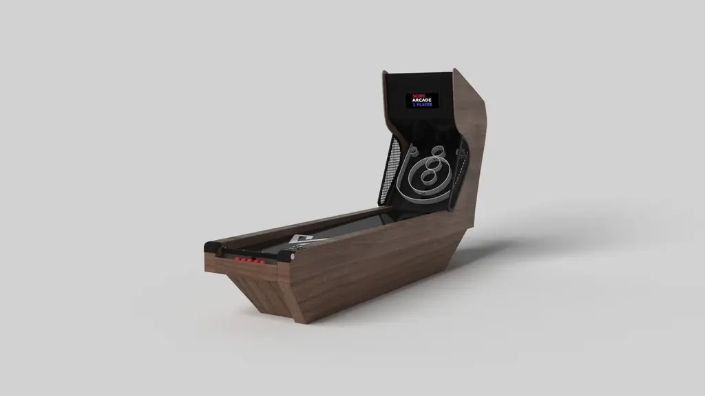Handcrafted with clean lines, sharp angles, and a pyramid base, the Vogue skeeball game strikes the perfect balance between sporty competition and contemporary design. Timeless in its appeal and detailed with built-in digital components, this custom game is beautifully crafted from durable wood with contrast accents that give it a cutting edge look.