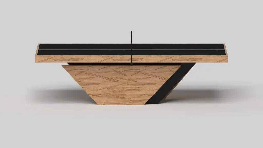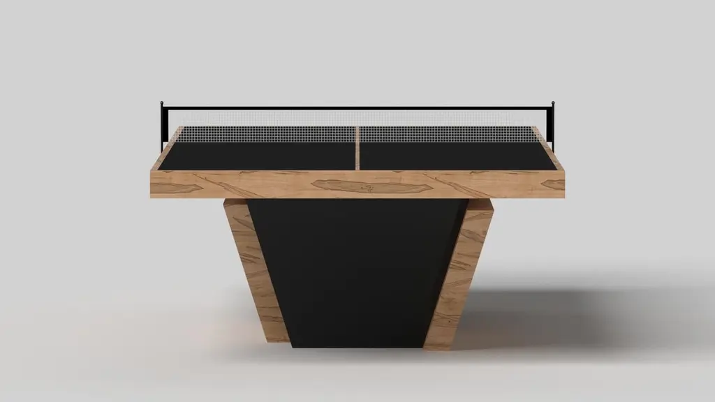 Handcrafted with clean lines, sharp angles, and a pyramid base, the Vogue table tennis table in chrome with black strikes the perfect balance between sport-inspired style and contemporary design. Timeless in its appeal and revered for its practicality and purpose, this custom game table is beautifully crafted from durable metal with solid black maple wood accents that give it a cutting edge look.Size:108”X60”X30”Custom Sizes Available Per Request