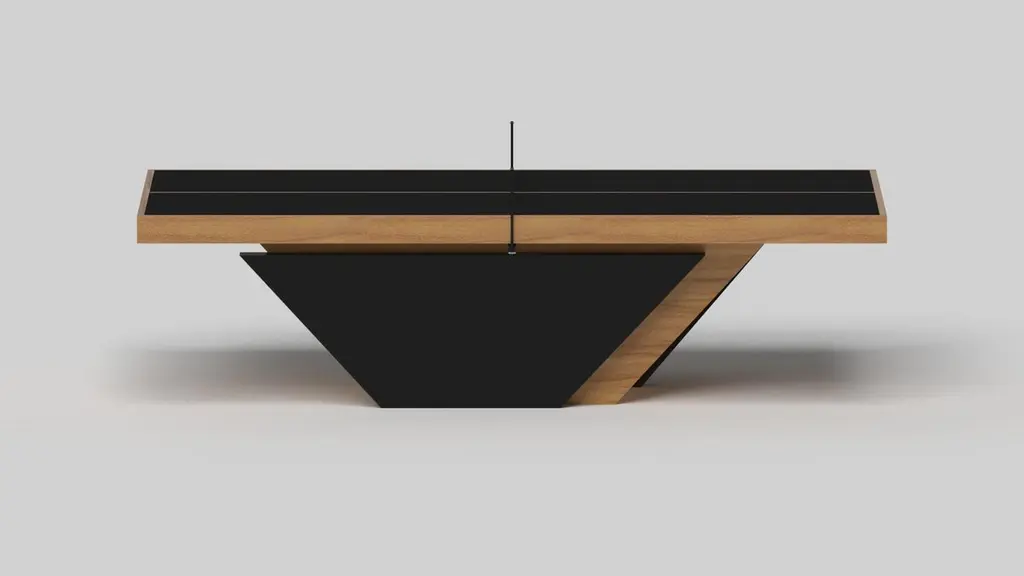 Handcrafted with clean lines, sharp angles, and a pyramid base, the Vogue table tennis table in chrome with black strikes the perfect balance between sport-inspired style and contemporary design. Timeless in its appeal and revered for its practicality and purpose, this custom game table is beautifully crafted from durable metal with solid black maple wood accents that give it a cutting edge look.Size:108”X60”X30”Custom Sizes Available Per Request