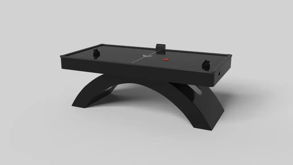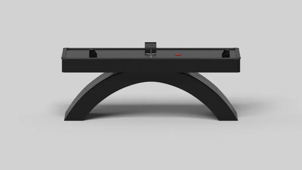 An open, arched base balances beautifully against the hard edges of the rectangular surface top, making the Zenith air hockey table in black with red a striking juxtaposition of modern, geometric forms. Minimalist in its appeal yet luxurious in design, this contemporary table is handcrafted from solid maple wood with a black oil stain and red accents that embody a vibrant, energetic sense of spirit.Size:88”X45”X31”