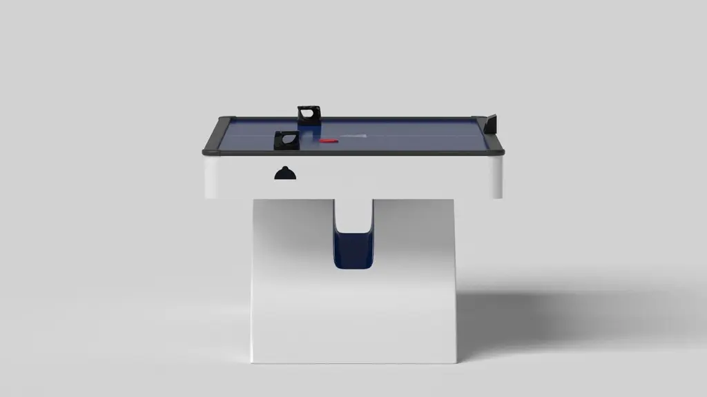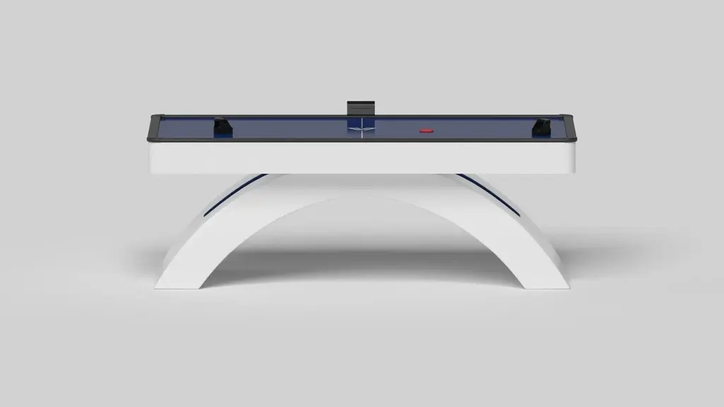 An open, arched base balances beautifully against the hard edges of the rectangular surface top, making the Zenith air hockey table in black with red a striking juxtaposition of modern, geometric forms. Minimalist in its appeal yet luxurious in design, this contemporary table is handcrafted from solid maple wood with a black oil stain and red accents that embody a vibrant, energetic sense of spirit.Size:88”X45”X31”