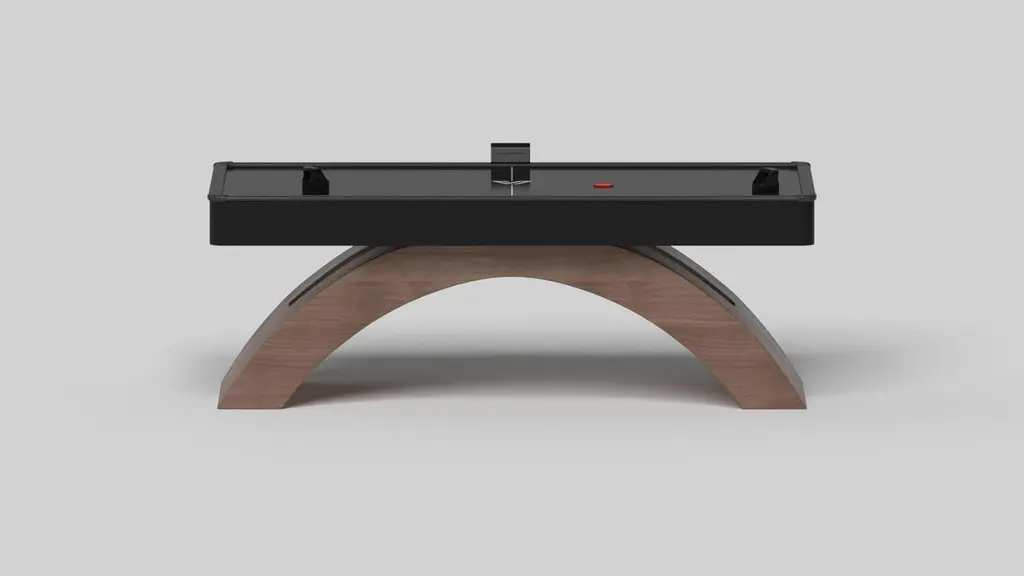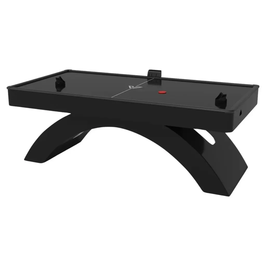 An open, arched base balances beautifully against the hard edges of the rectangular surface top, making the Zenith air hockey table in black with red a striking juxtaposition of modern, geometric forms. Minimalist in its appeal yet luxurious in design, this contemporary table is handcrafted from solid maple wood with a black oil stain and red accents that embody a vibrant, energetic sense of spirit.Size:88”X45”X31”