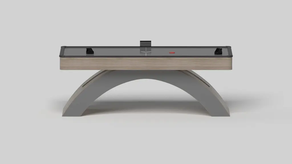 An open, arched base balances beautifully against the hard edges of the rectangular surface top, making the Zenith air hockey table in black with red a striking juxtaposition of modern, geometric forms. Minimalist in its appeal yet luxurious in design, this contemporary table is handcrafted from solid maple wood with a black oil stain and red accents that embody a vibrant, energetic sense of spirit.Size:88”X45”X31”