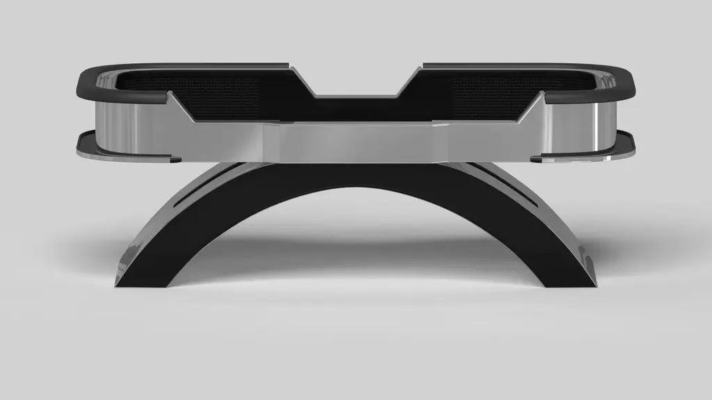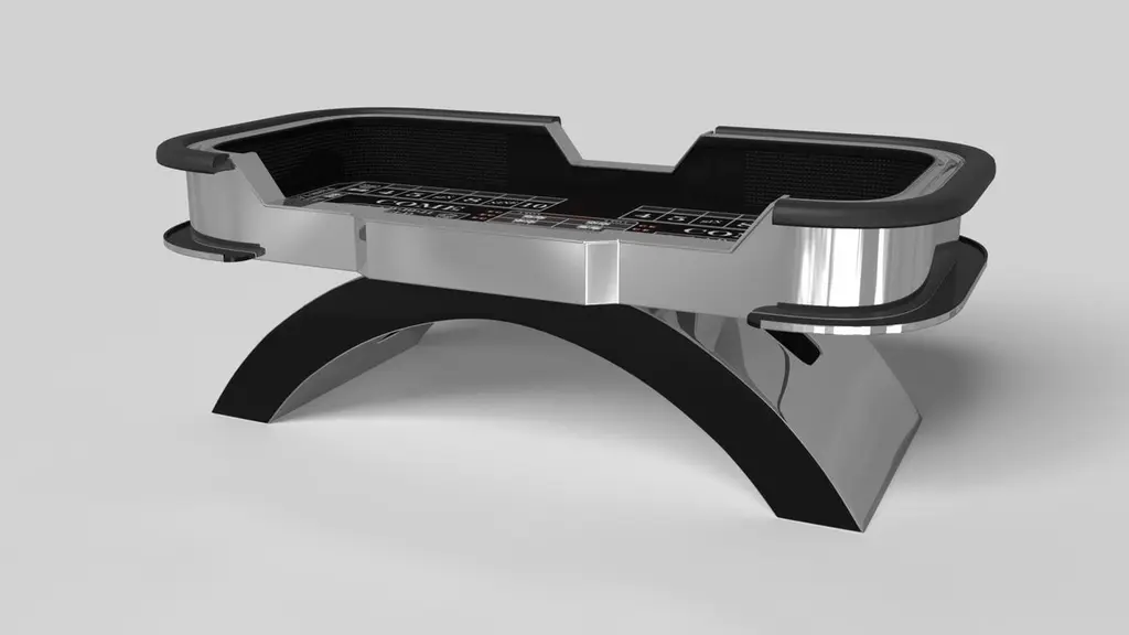 An open, arched base balances beautifully against the hard edges of the rectangular surface top, making the Zenith craps table in black with red a striking juxtaposition of modern, geometric forms. Minimalist in its appeal yet luxurious in design, this contemporary table is handcrafted with a professional tabletop and distinctive details that embody an open-minded, open-ended sense of spirit.Size:117”X60”X42”Custom Sizes Available Per Request