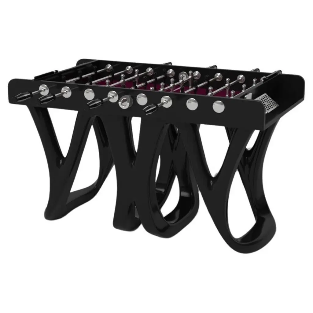 An open, arched base balances beautifully against the hard edges of the rectangular surface top, making the Zenith foosball table in black with red a striking juxtaposition of modern, geometric forms. Minimalist in its appeal yet luxurious in design, this contemporary table is handcrafted from solid maple wood with a black oil stain and red accents that embody a vibrant, energetic sense of spirit.Size:62”X31”X36”