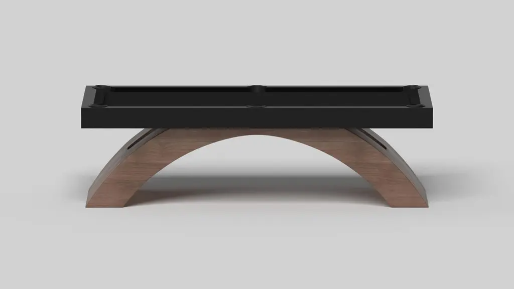 An open, arched base balances beautifully against the hard edges of the rectangular surface top, making the Zenith pool table in black with red a striking juxtaposition of modern, geometric forms. Minimalist in its appeal yet luxurious in design, this contemporary table is handcrafted from solid maple wood with a black oil stain and red accents that embody a vibrant, energetic sense of spirit.Size:7 Foot - 91”X52”Playing Area Of 39”X78”8 Foot – 101”X57”Playing Area Of 88”X44”