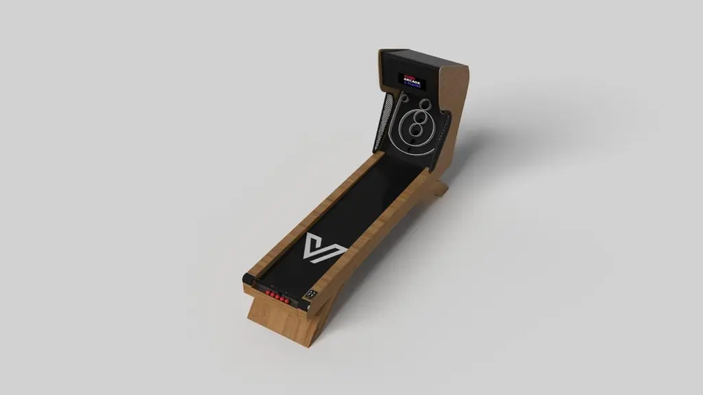 An open, arched base balances beautifully against the hard edges of the back support, making the Zenith skeeball game a striking juxtaposition of modern, geometric forms. Minimalist yet luxurious, this design is handcrafted from solid wood and detailed with digital components, including LED lights, that add a vibrant, energetic sense of spirit.