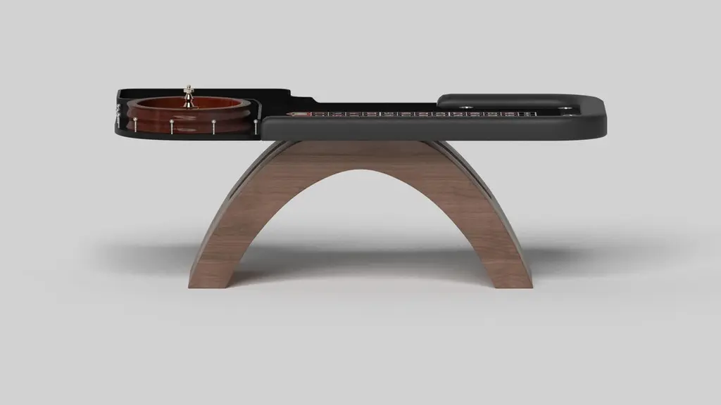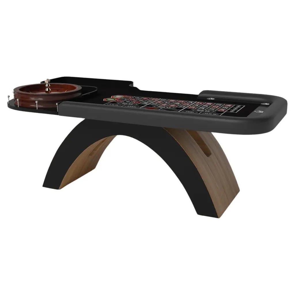 An open, arched base balances beautifully against the hard edges of the rectangular surface top, making the Zenith roulette table in black and red a striking juxtaposition of modern, geometric forms. Minimalist in its appeal yet luxurious in design, this contemporary table is handcrafted with an American roulette wheel, casino-grade betting blocks, and distinctive details that embody an open-minded, open-ended sense of spirit.Size:98”X50”X30”Custom Sizes Available Per Request