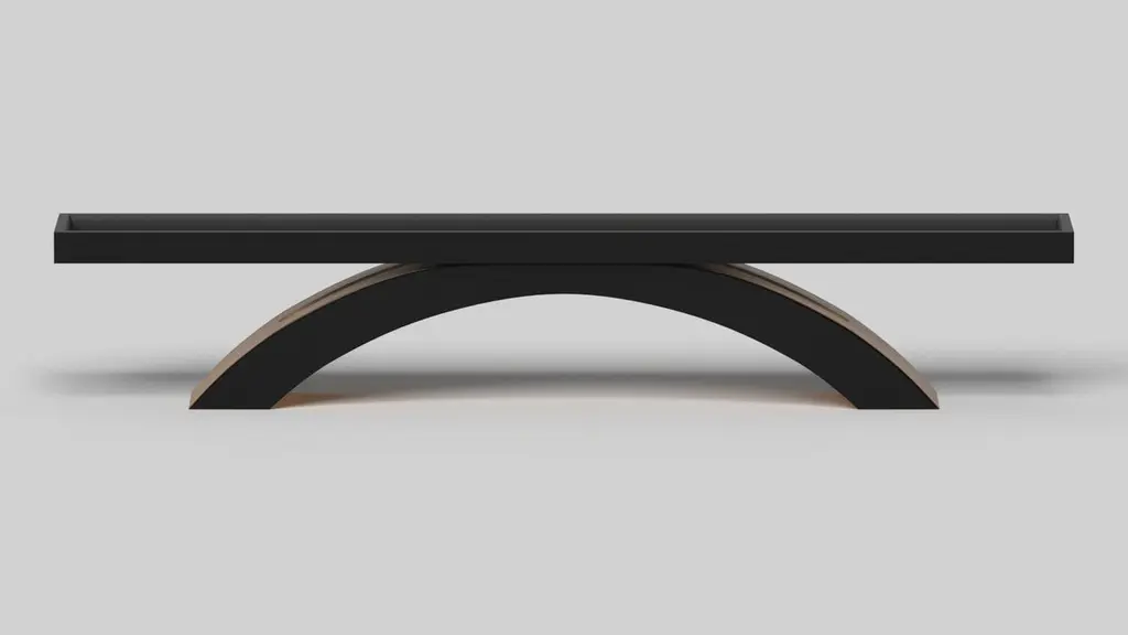 An open, arched base balances beautifully against the hard edges of the rectangular surface top, making the Zenith shuffleboard table in black with red a striking juxtaposition of modern, geometric forms. Minimalist in its appeal yet luxurious in design, this contemporary table is handcrafted from solid maple wood with a black oil stain and red accents that embody a vibrant, energetic sense of spirit.Size:12 Foot - 144”X32”X34”Playing Area Of 128”X20”