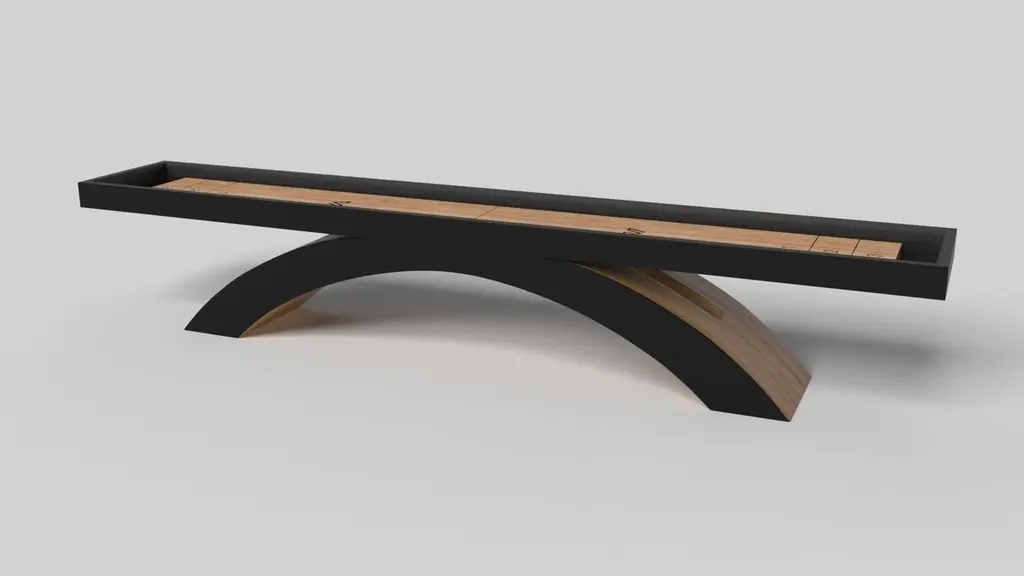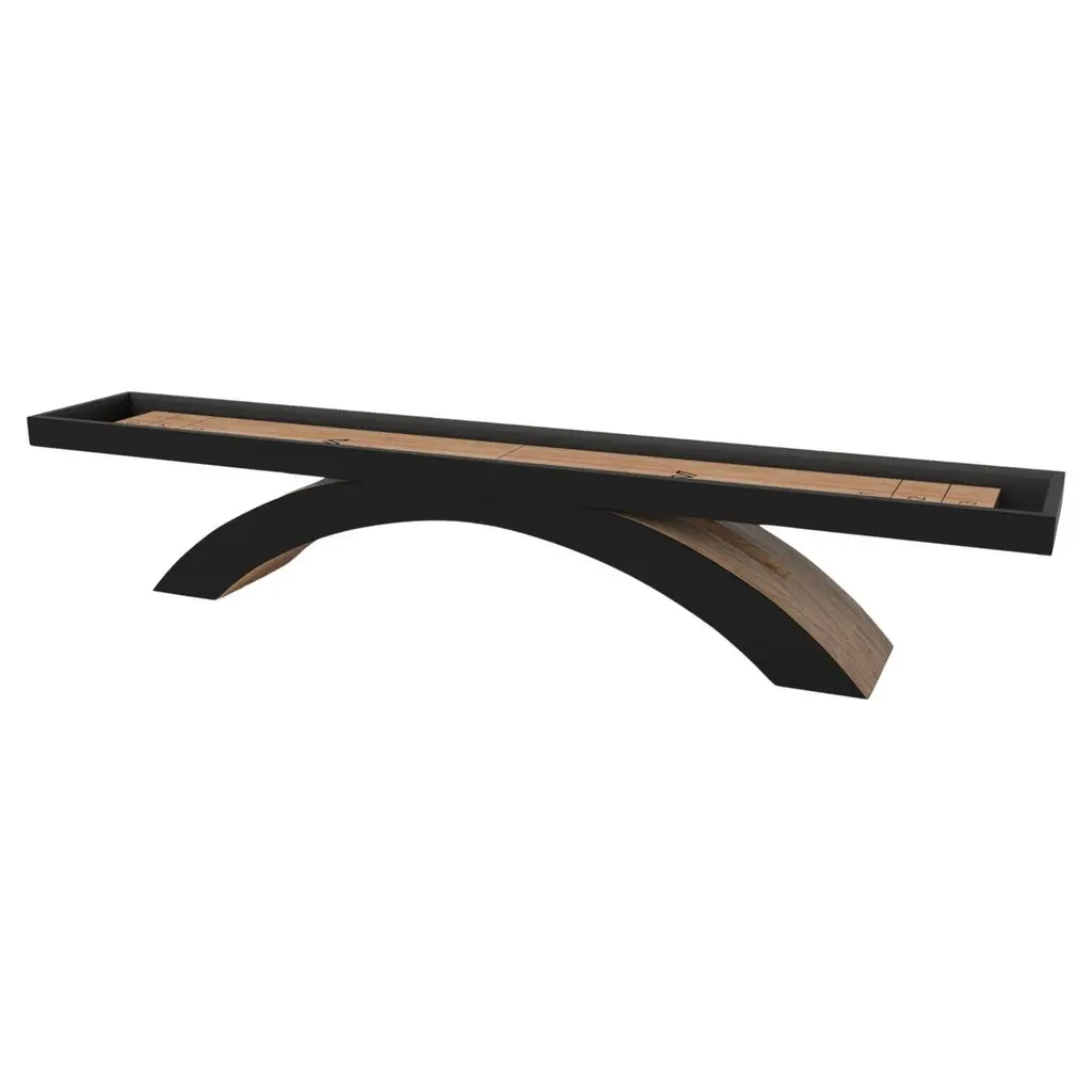 An open, arched base balances beautifully against the hard edges of the rectangular surface top, making the Zenith shuffleboard table in black with red a striking juxtaposition of modern, geometric forms. Minimalist in its appeal yet luxurious in design, this contemporary table is handcrafted from solid maple wood with a black oil stain and red accents that embody a vibrant, energetic sense of spirit.Size:14 Foot - 168”X32”X34”Playing Area Of 152”X20”