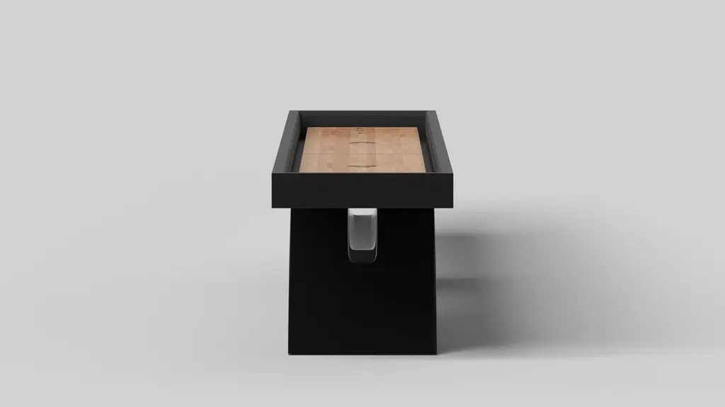 An open, arched base balances beautifully against the hard edges of the rectangular surface top, making the Zenith shuffleboard table in black with red a striking juxtaposition of modern, geometric forms. Minimalist in its appeal yet luxurious in design, this contemporary table is handcrafted from solid maple wood with a black oil stain and red accents that embody a vibrant, energetic sense of spirit.Size:12 Foot - 144”X32”X34”Playing Area Of 128”X20”