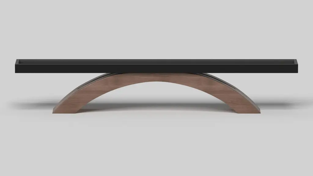 An open, arched base balances beautifully against the hard edges of the rectangular surface top, making the Zenith shuffleboard table in black with red a striking juxtaposition of modern, geometric forms. Minimalist in its appeal yet luxurious in design, this contemporary table is handcrafted from solid maple wood with a black oil stain and red accents that embody a vibrant, energetic sense of spirit.Size:16 Foot - 192”X32”X34”Playing Area Of 176”X20”