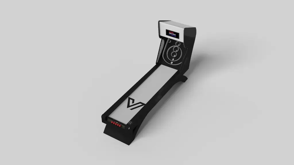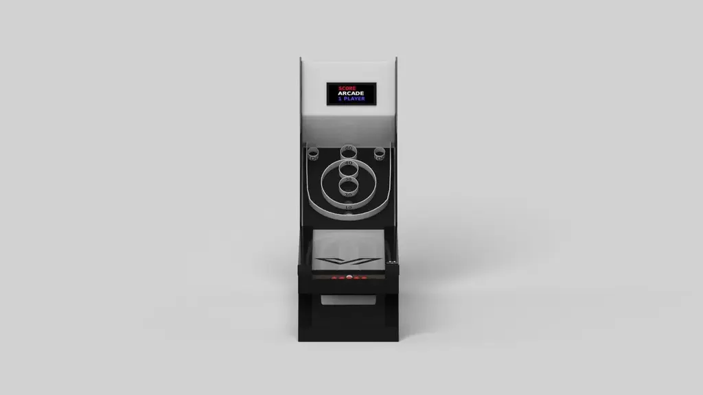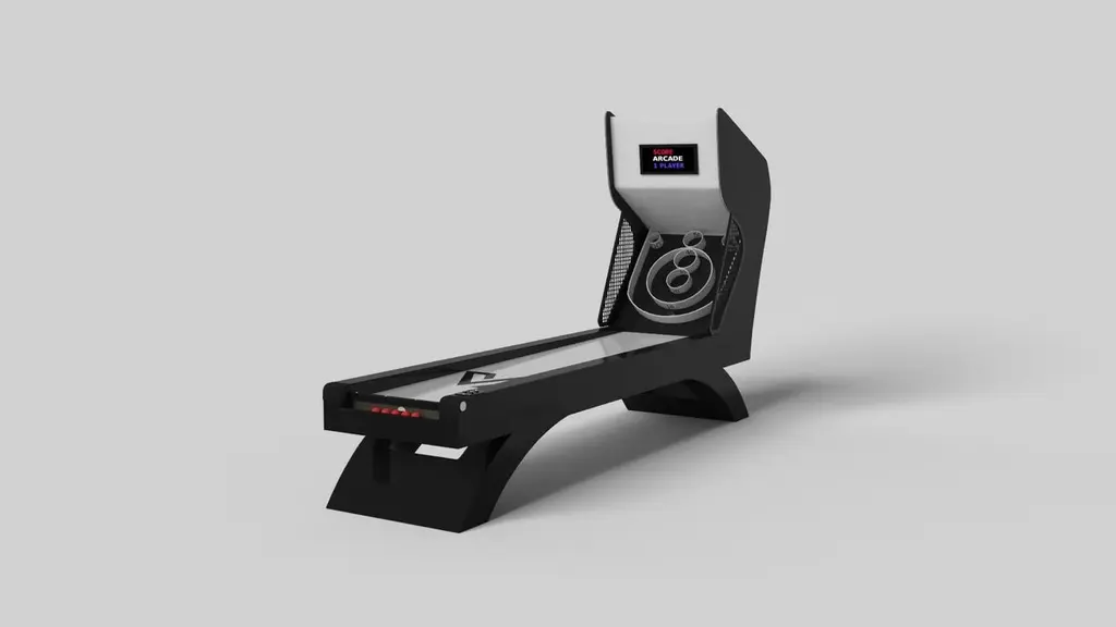 An open, arched base balances beautifully against the hard edges of the back support, making the Zenith skeeball game a striking juxtaposition of modern, geometric forms. Minimalist yet luxurious, this design is handcrafted from solid wood and detailed with digital components, including LED lights, that add a vibrant, energetic sense of spirit.