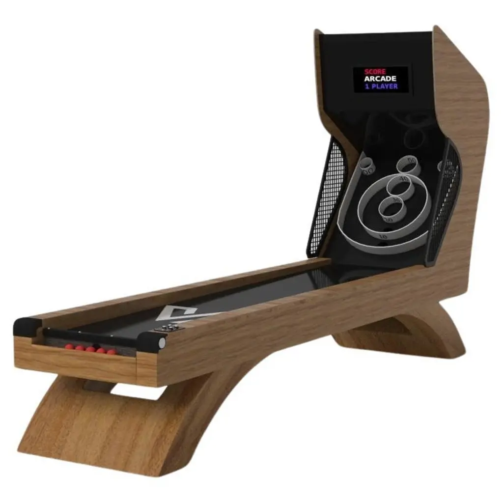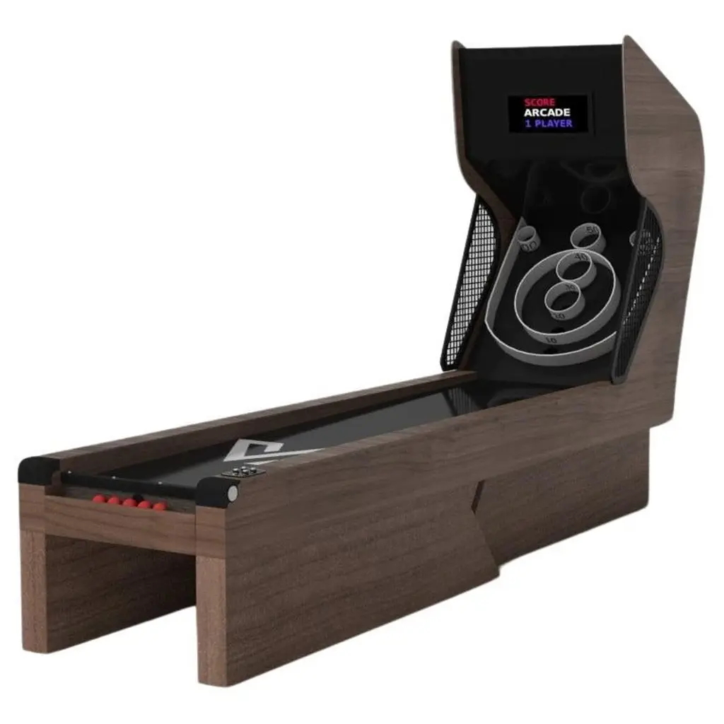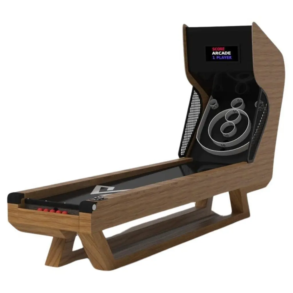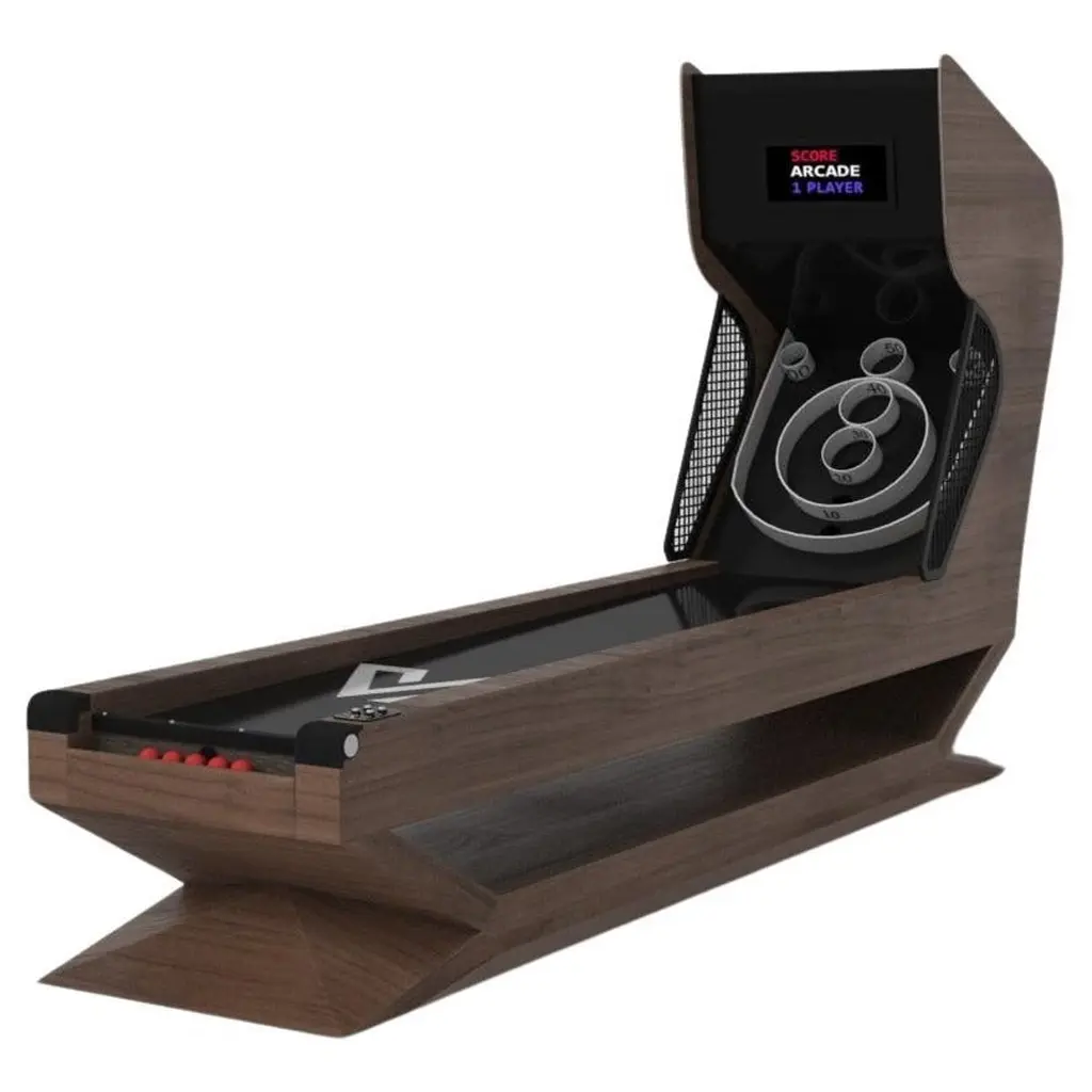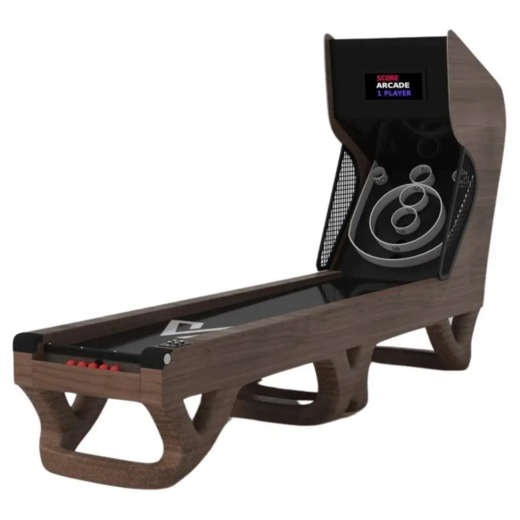 An open, arched base balances beautifully against the hard edges of the back support, making the Zenith skeeball game a striking juxtaposition of modern, geometric forms. Minimalist yet luxurious, this design is handcrafted from solid wood and detailed with digital components, including LED lights, that add a vibrant, energetic sense of spirit.