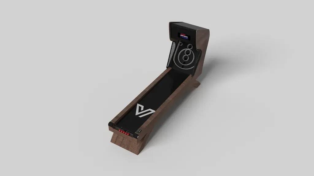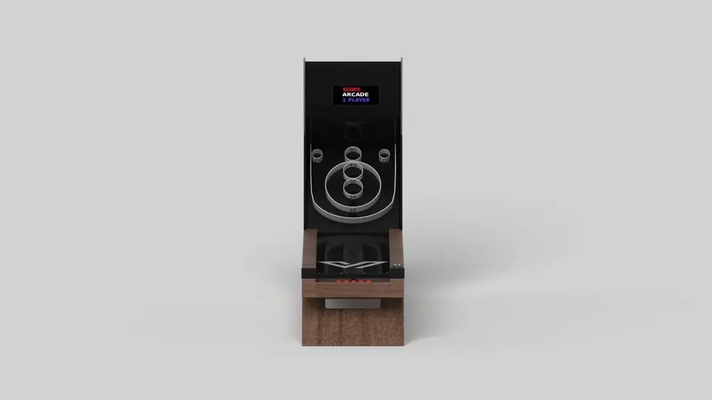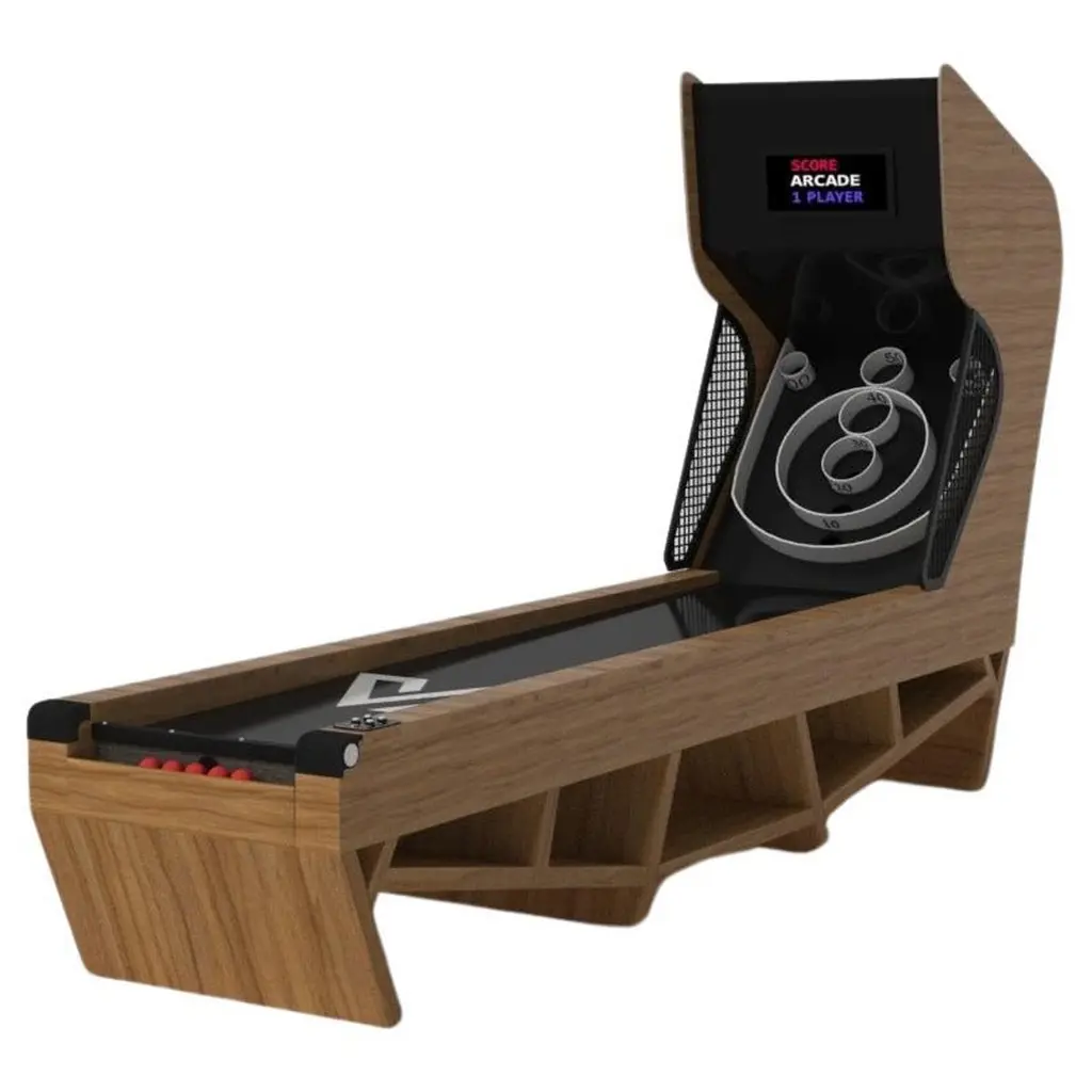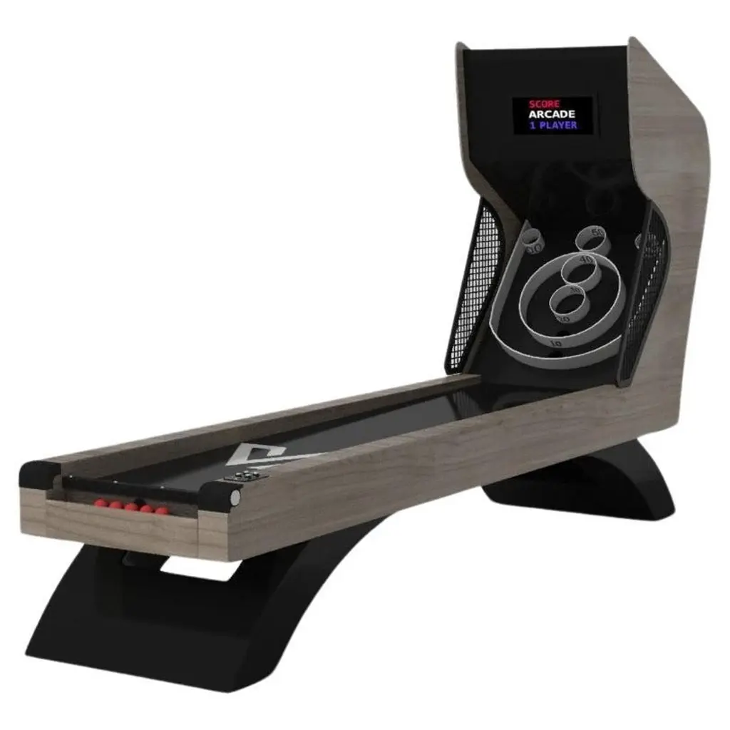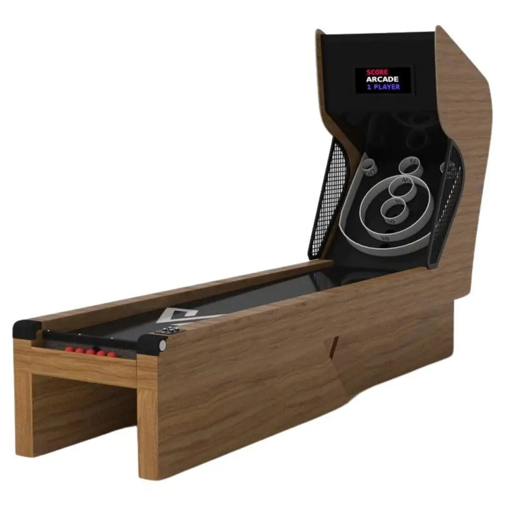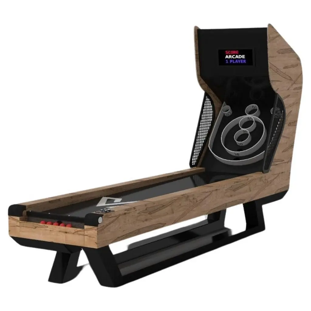 An open, arched base balances beautifully against the hard edges of the back support, making the Zenith skeeball game a striking juxtaposition of modern, geometric forms. Minimalist yet luxurious, this design is handcrafted from solid wood and detailed with digital components, including LED lights, that add a vibrant, energetic sense of spirit.