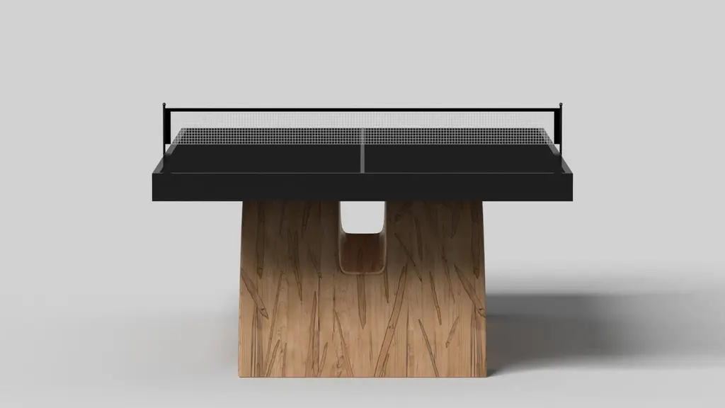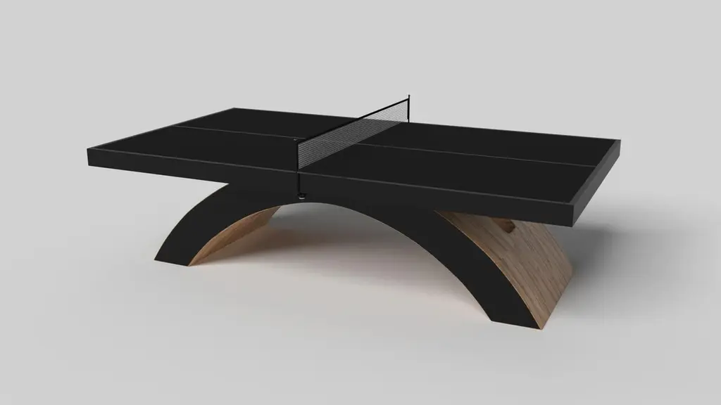 An open, arched base balances beautifully against the hard edges of the rectangular surface top, making the Zenith table tennis table in black with red a striking juxtaposition of modern, geometric forms. Minimalist in its appeal yet luxurious in design, this contemporary table is handcrafted from solid maple wood with a black oil stain and red accents that embody a vibrant, energetic sense of spirit.Size:108”X60”X30”Custom Sizes Available Per Request
