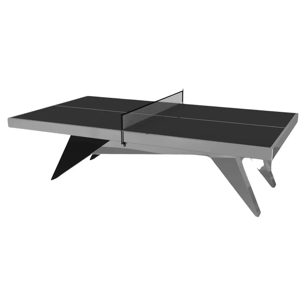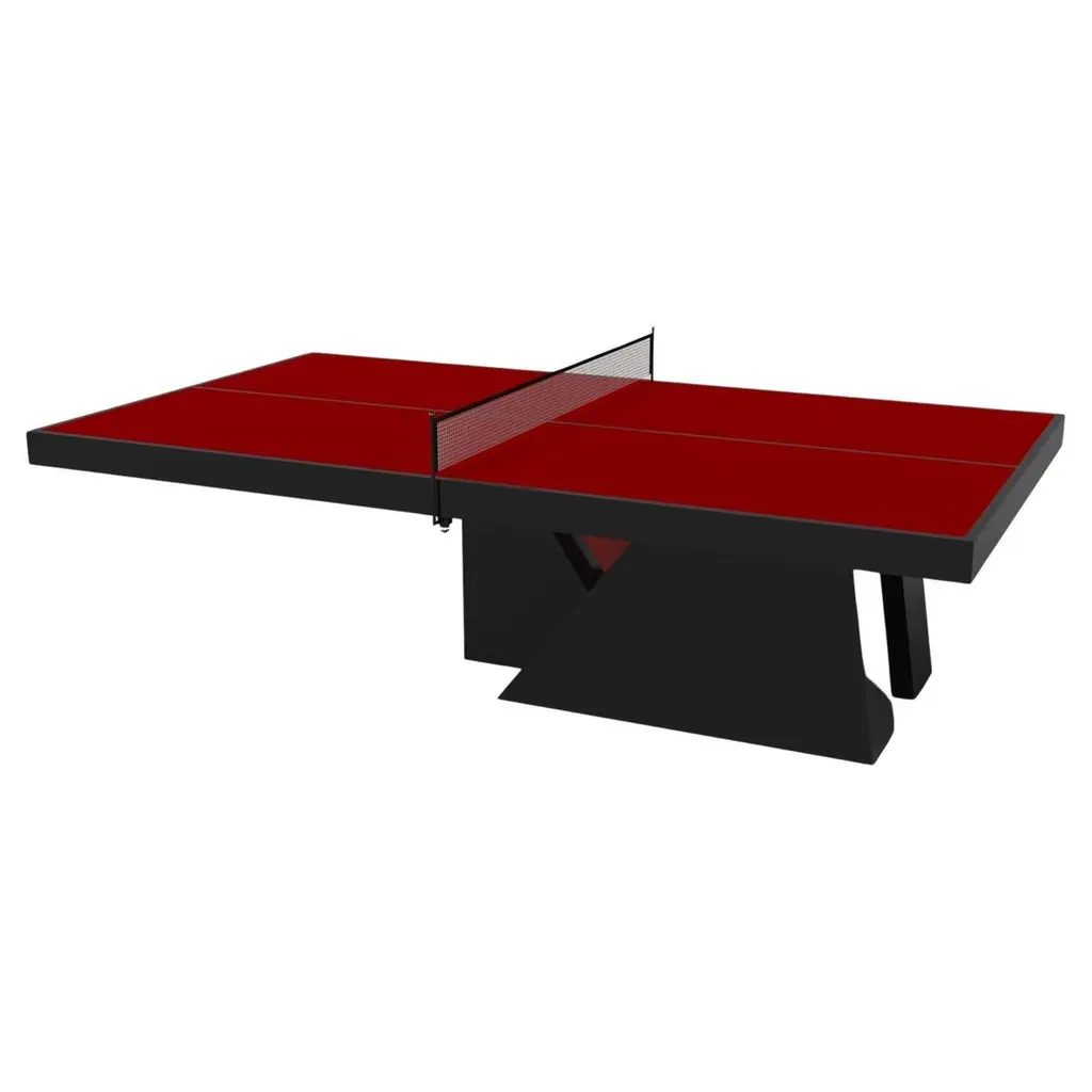 An open, arched base balances beautifully against the hard edges of the rectangular surface top, making the Zenith table tennis table in black with red a striking juxtaposition of modern, geometric forms. Minimalist in its appeal yet luxurious in design, this contemporary table is handcrafted from solid maple wood with a black oil stain and red accents that embody a vibrant, energetic sense of spirit.Size:108”X60”X30”Custom Sizes Available Per Request