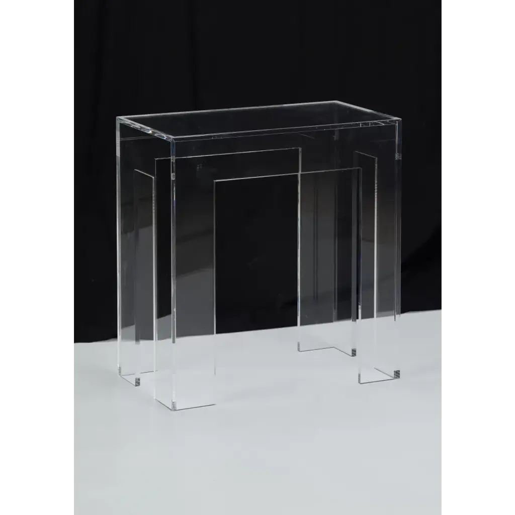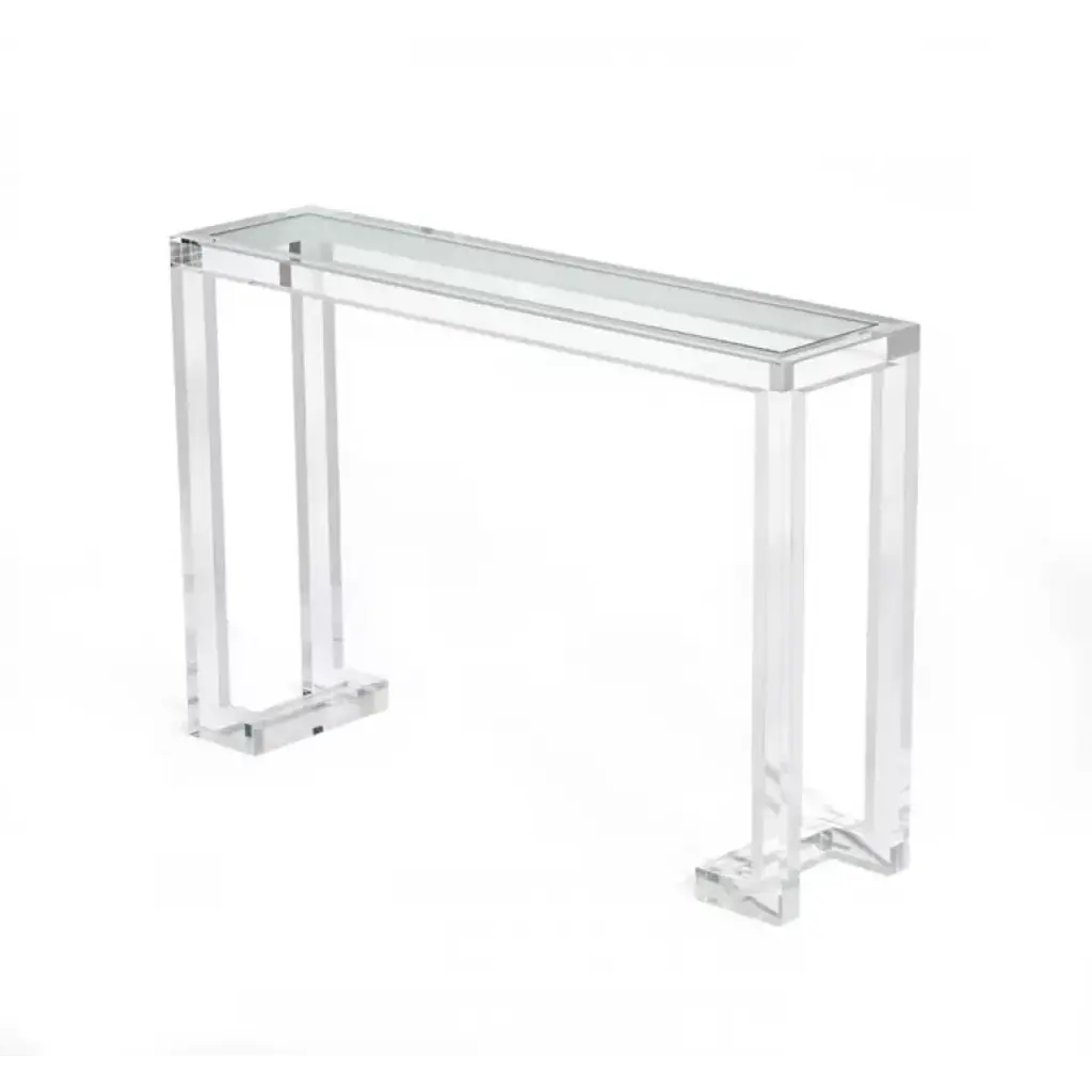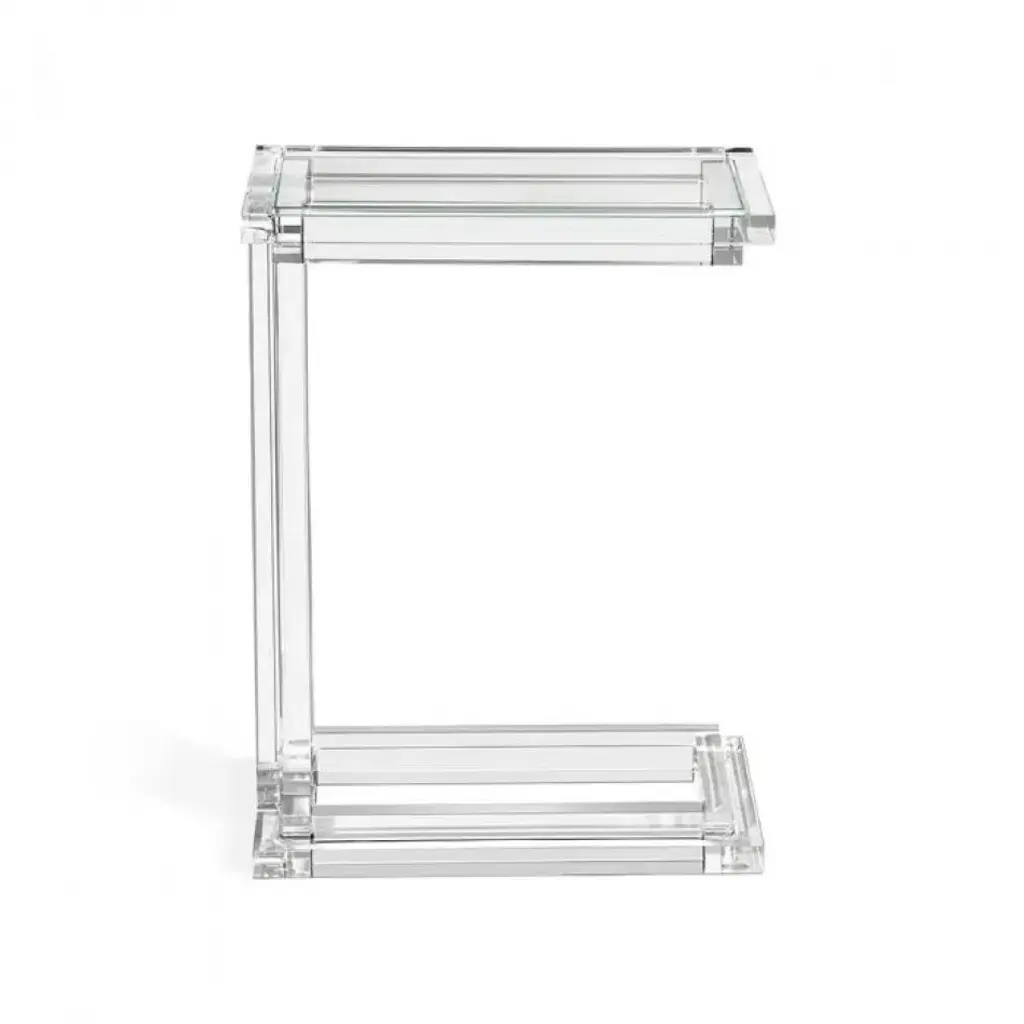 Clear acrylic and crystal glass transform the Elle Hugging Table into a versatile of-the-moment statement. Intricate channeling along the legs and apron elevate this classic silhouette.