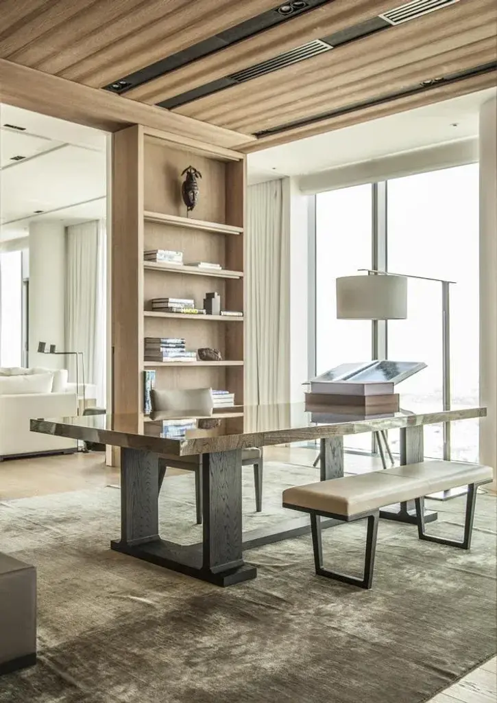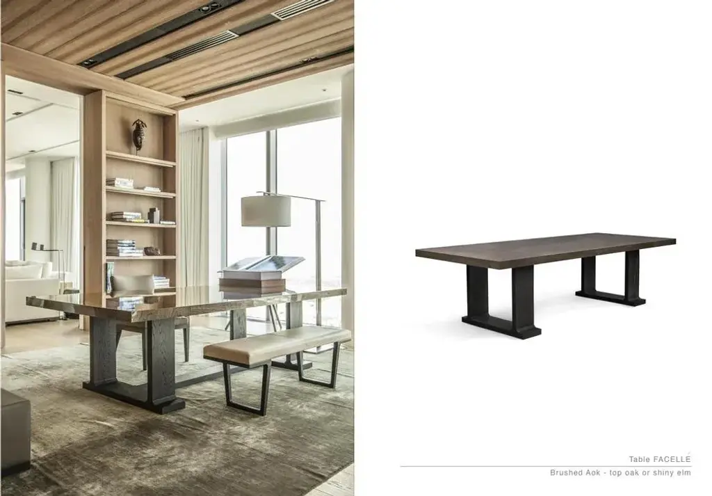 Elm fazelle table by lk edition dimensions: 280 x 120 x h 74 cm materials: bright varnished elm and, stained brushed oak. It is with the sense of detail and requirement, this research of the exception by the selection of noble materials and his culture of the french know-how, that lk has built up its principles and set up his skills. Lk will meet your expectations and your requirements in residential, hotel, trade, yachts \. And custom-made furniture.