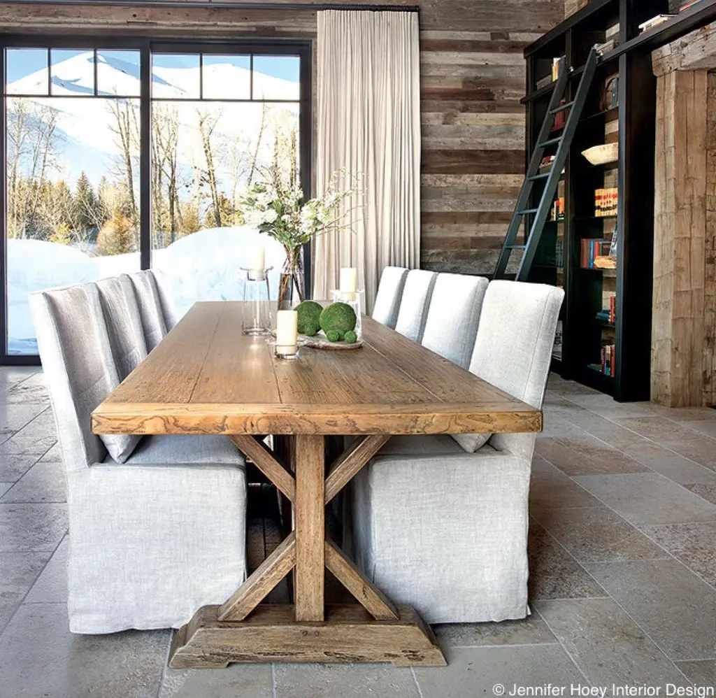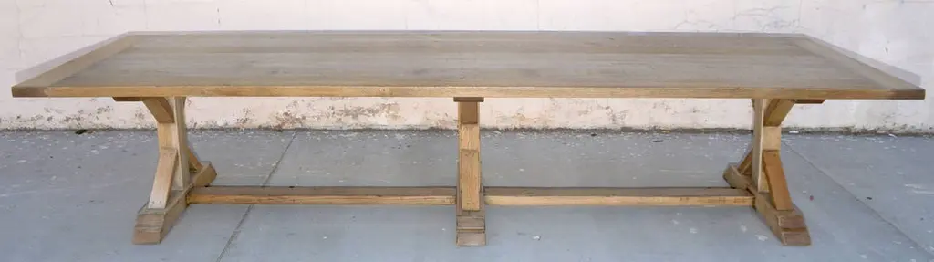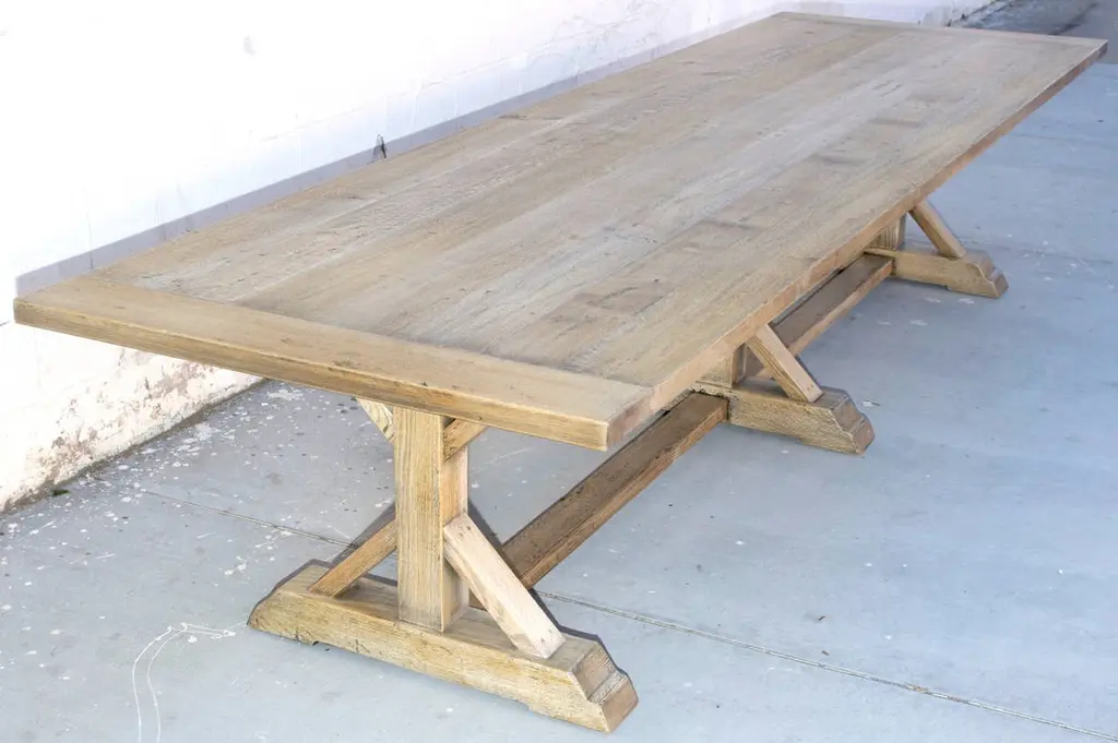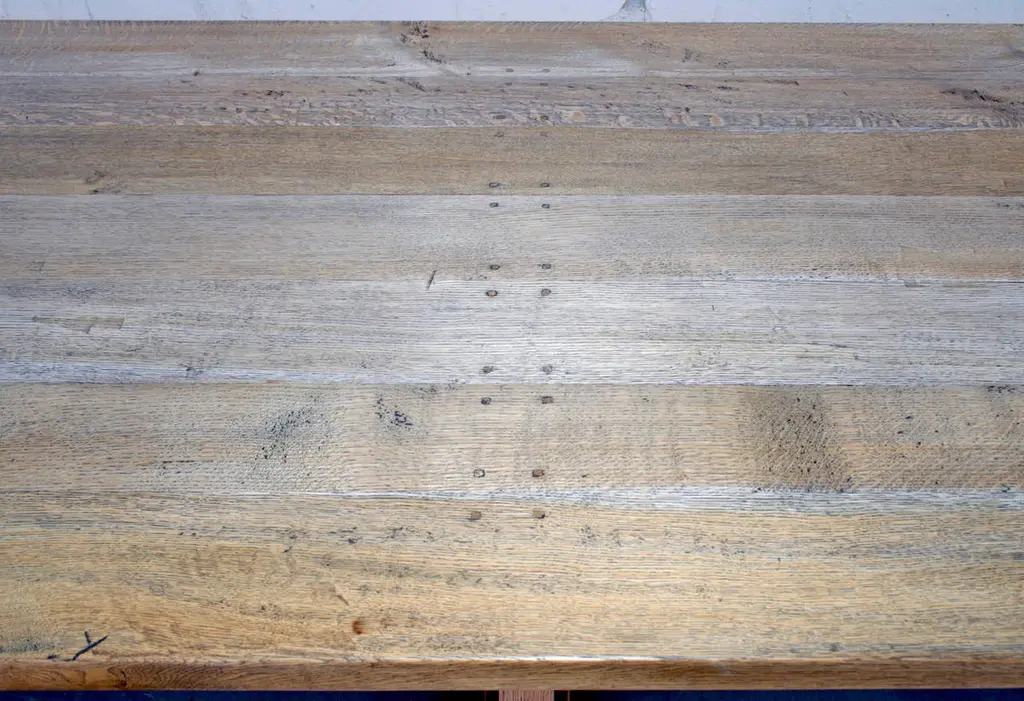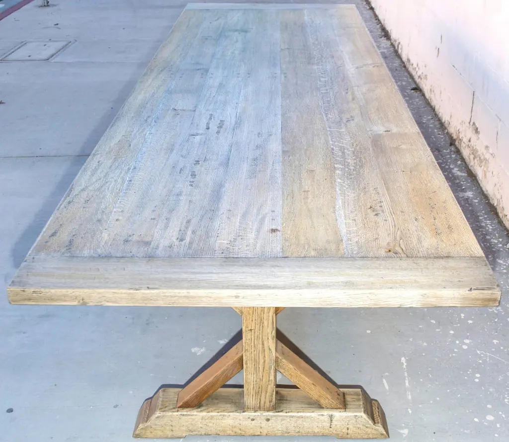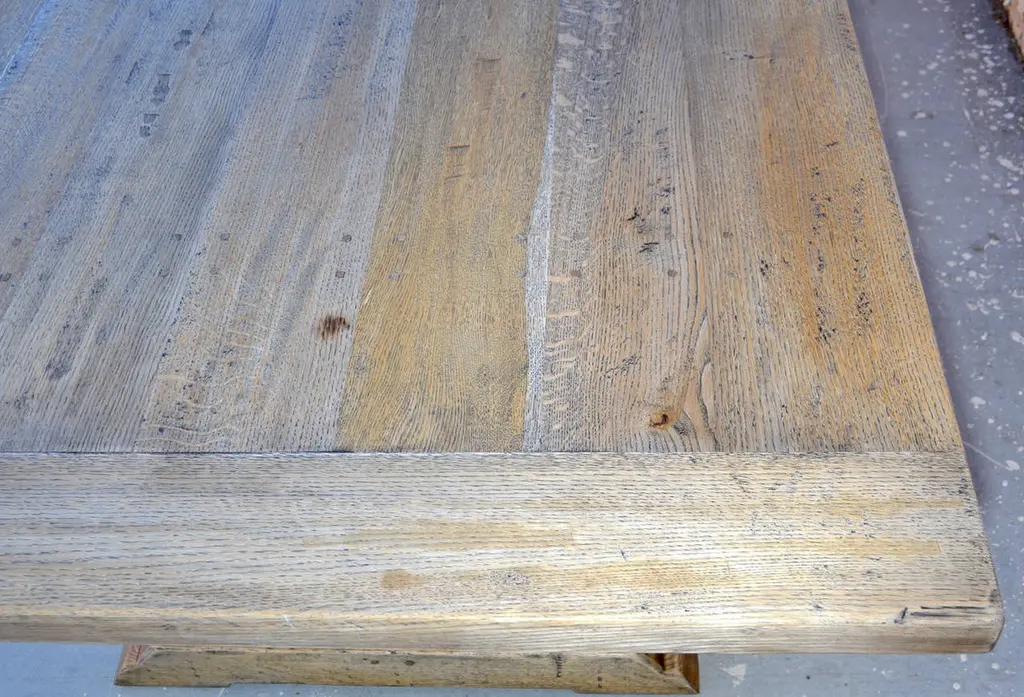 This farm table is built using reclaimed, distressed oak - this massive table is very solid! Because each table is bench-made in our own Los Angeles workshop you can influence all aspects of design, including size, wood species and finish. We use only traditional carpentry techniques, mortise and tenon construction reinforced with hand-cut wooden dowels. No nails or metal fasteners of any kind are used. If you require customized overhang dimensions please stipulate with order.